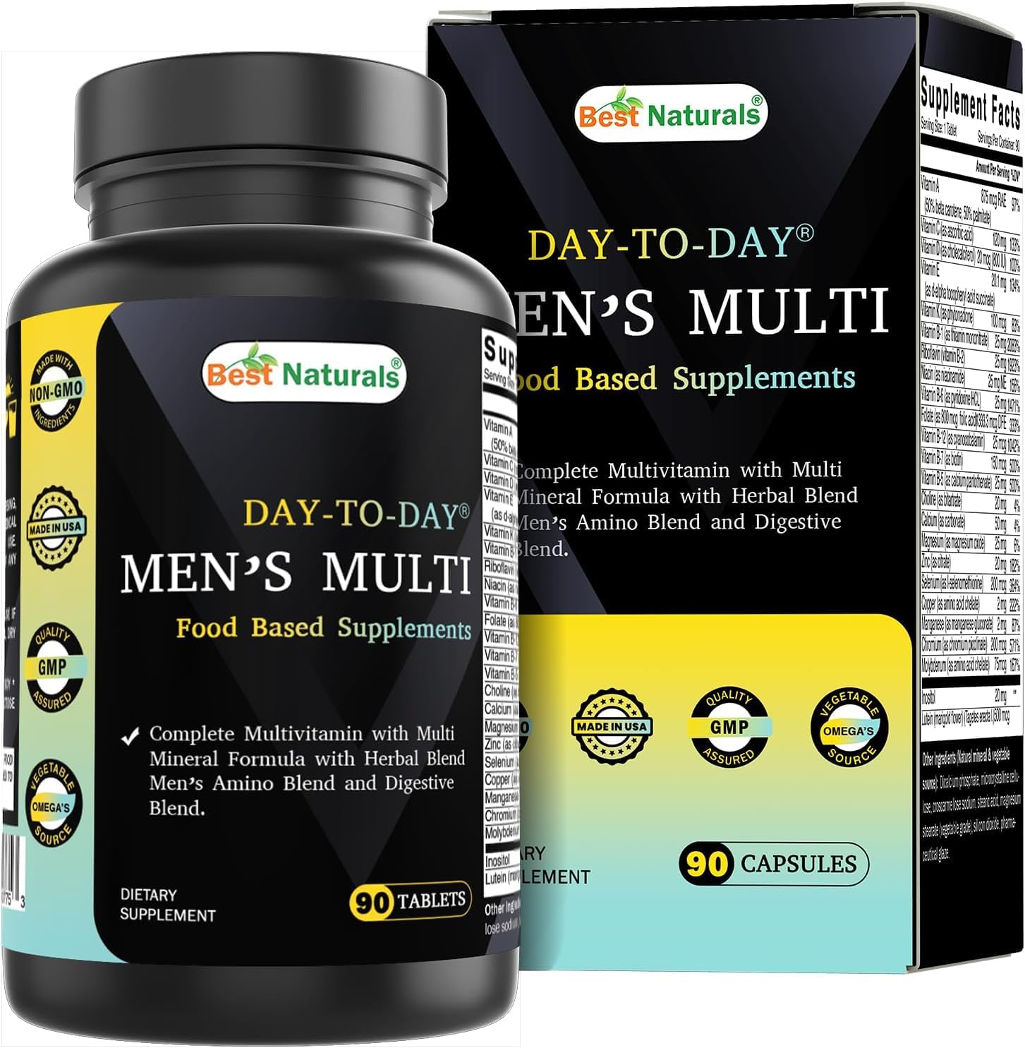 Best Naturals Day-To-Day Men's Multi is a food-based multivitamin supplement specially formulated with essential nutrients including Vitamin A, L-Arginine, L-Glutamine, and L-Lysine. Designed for daily support, this formula combines vitamins, amino acids, and plant-based ingredients in a convenient tablet form. It is Non-GMO, Gluten-Free, and third-party lab tested for purity and quality. Manufactured in the USA in a GMP-compliant, FDA-registered facility, it contains no artificial colors, flavors, sweeteners, preservatives, or common allergens.