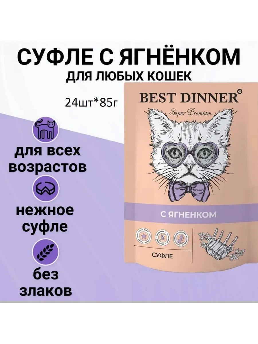Комплектация:Влажный корм Best Dinner для кошек и котят Мясные деликатесы суфле с ягненком 85гр*24шт