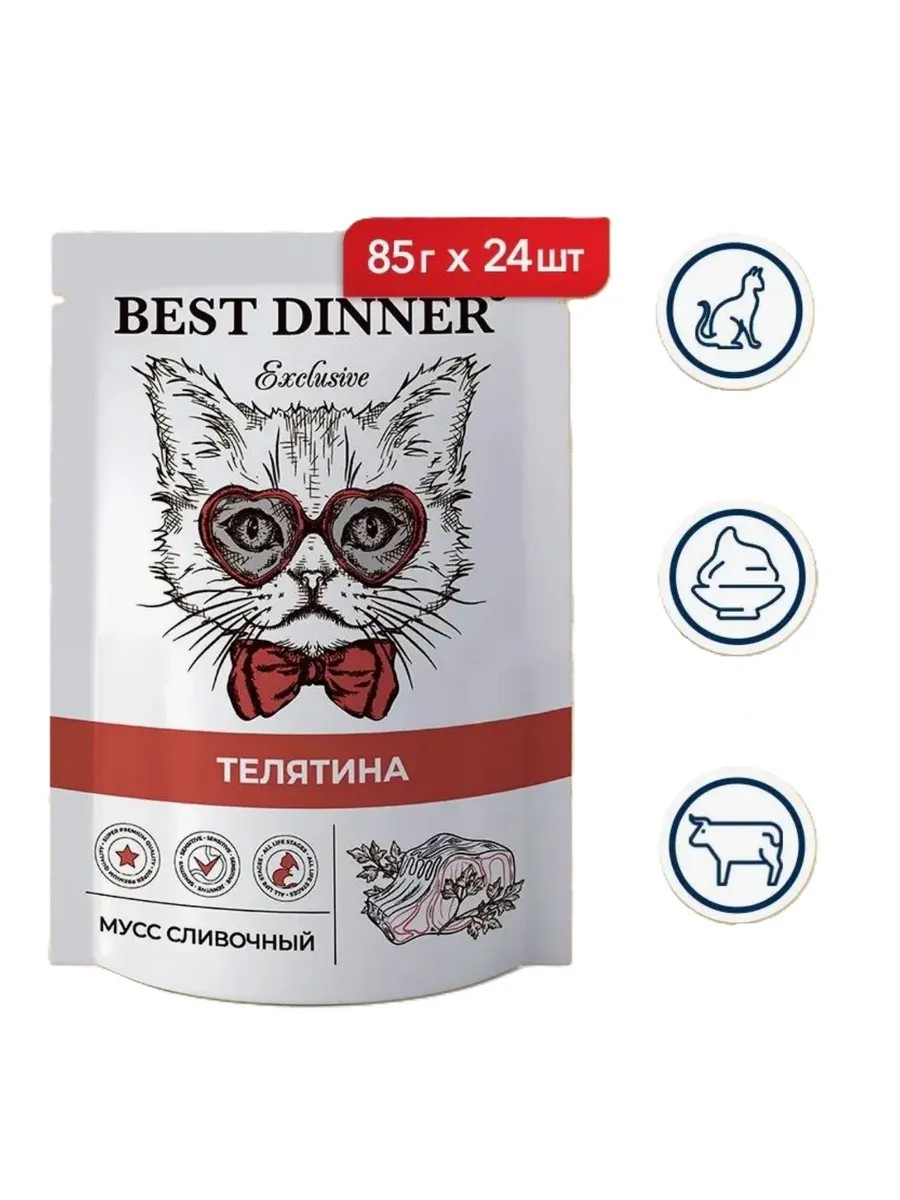 Best Dinner Exclusive паучи для кошек мусс сливочный с телятиной 85г*24шт. Мусс из натурального мяса телятины высшего сорта. Без субпродуктов, с добавлением молочных сливок, пшеничной муки - в качестве загустителя и углеводного компонента, подсолнечного масла -источника витамина Е, рыбьего жира - источника витаминов А и Д и дрожжей - источника витаминов группы В.
