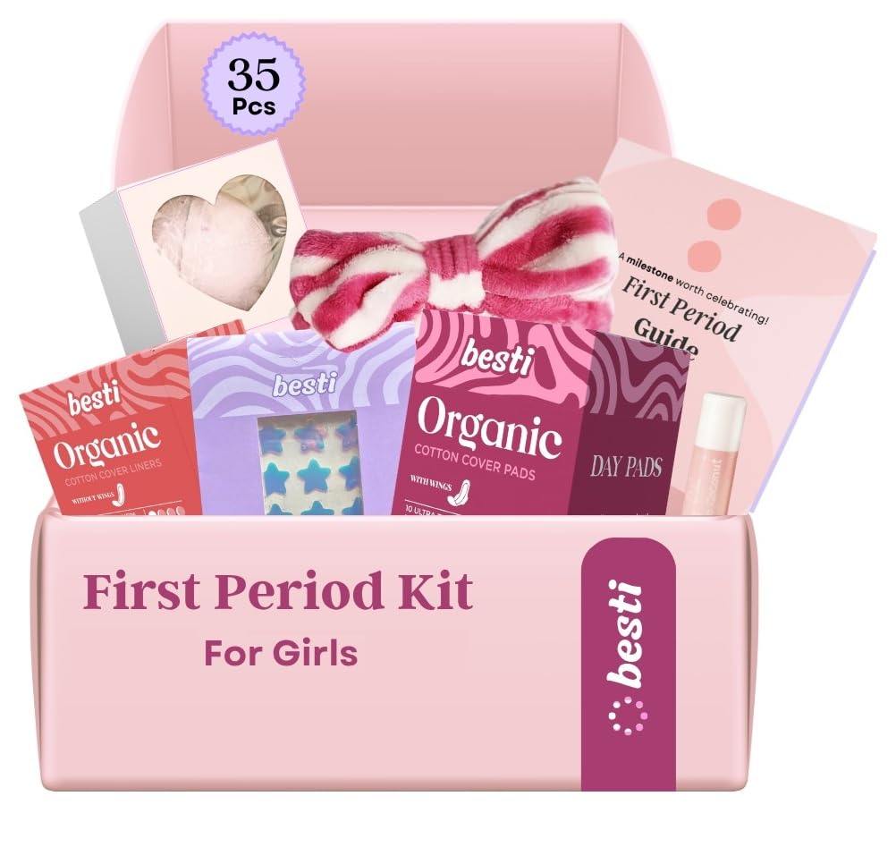 Besti First Period Kit for Girls (Ages 9-12) | Organic Pads & Liners Pimple Patches Bath Bomb Lip Balm Spa Headband & First Period Guide | Self-Care Gift Box for Teens Menstrual Starter Kit