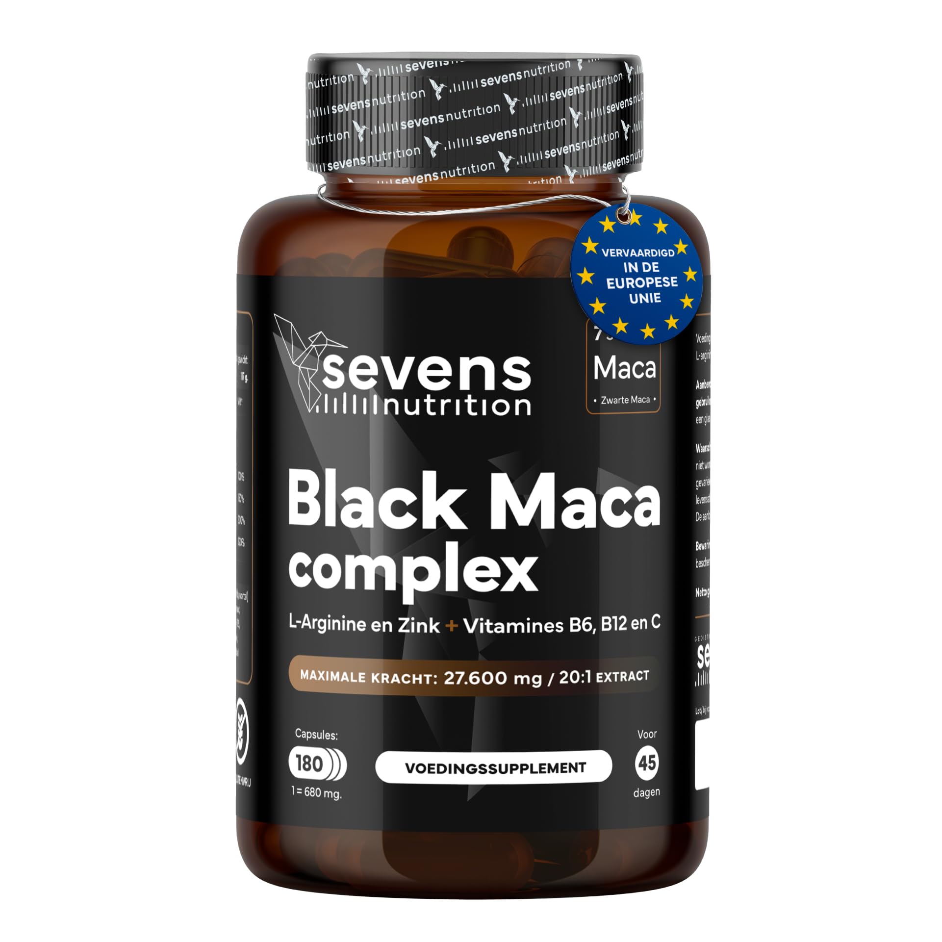 MANUFACTURED IN THE EU ACCORDING TO STRICT EUROPEAN STANDARDS: Developed with high-quality, controlled ingredients and without unnecessary additives. Transparency, safety and effectiveness guarantee every capsule. HIGH QUALITY: 180 vegan black maca capsules. Sufficient for 45 days. Easy to take, tasteless, gluten-free, lactose-free, GMO-free and suitable for vegans. SUPPORTS NORMAL HORMONE LEVELS: thanks to zinc, this contributes to the maintenance of normal testosterone levels in men and normal reproductive function in both men and women. ? ENERGY, CONCENTRATION AND VITALITY: Our black maca contains vitamins B6, B12 and C, which help reduce fatigue and exhaustion and contribute to normal energy metabolism and psychological functions. Ideal during periods of stress, sports or physical and mental fatigue. POTENCY AND EFFECTIVENESS IN EVERY DOSE: 20:1 black maca extract (equivalent to 27,600 mg), combined with L-arginine, zinc and vitamins B6, B12 and C for optimal effectiveness. Ideal for men and women who want to support their energy, balance and daily performance.Maca Complex 27 600 mg Hoge Dosis - 180 Capsules - Peruaanse Maca Zwart 20:1 Extract Met L-Arginine, Zink En Vitaminen B6, B12 En C - Capsules Voor Energie En Vitaliteit – Veganistisch - SevensGEPRODUCEERD IN DE EU VOLGENS STRIKTE EUROPESE NORMEN: Ontwikkeld met hoogwaardige, gecontroleerde ingrediënten en zonder onnodige additieven. Transparantie, veiligheid en effectiviteit staan garant voor elke capsule. HOGE KWALITEIT: 180 vegan zwarte maca-capsules. Voldoende voor 45 dagen. Makkelijk in te nemen, smaakloos, glutenvrij, lactosevrij, GMO-vrij en geschikt voor veganisten. ONDERSTEUNT NORMALE HORMOONSPIEGELS: dankzij zink draagt dit bij aan het behoud van normale testosteronniveaus bij mannen en een normale voortplantingsfunctie bij zowel mannen als vrouwen. ? ENERGIE, CONCENTRATIE EN VITALITEIT: onze zwarte maca bevat de vitamines B6, B12 en C, die helpen vermoeidheid en uitputting te verminderen en bijdragen aan een normaal energiemetabolisme en de psychologische functies. Ideaal tijdens periodes van stress, sport of fysieke en mentale vermoeidheid. KRACHT EN EFFECTIVITEIT IN ELKE DOSIS: 20:1-extract van zwarte maca (equivalent aan 27.600 mg), gecombineerd met L-arginine, zink en de vitamines B6, B12 en C voor een optimale werking. Ideaal voor mannen en vrouwen die hun energie, balans en dagelijkse prestaties willen ondersteunen.