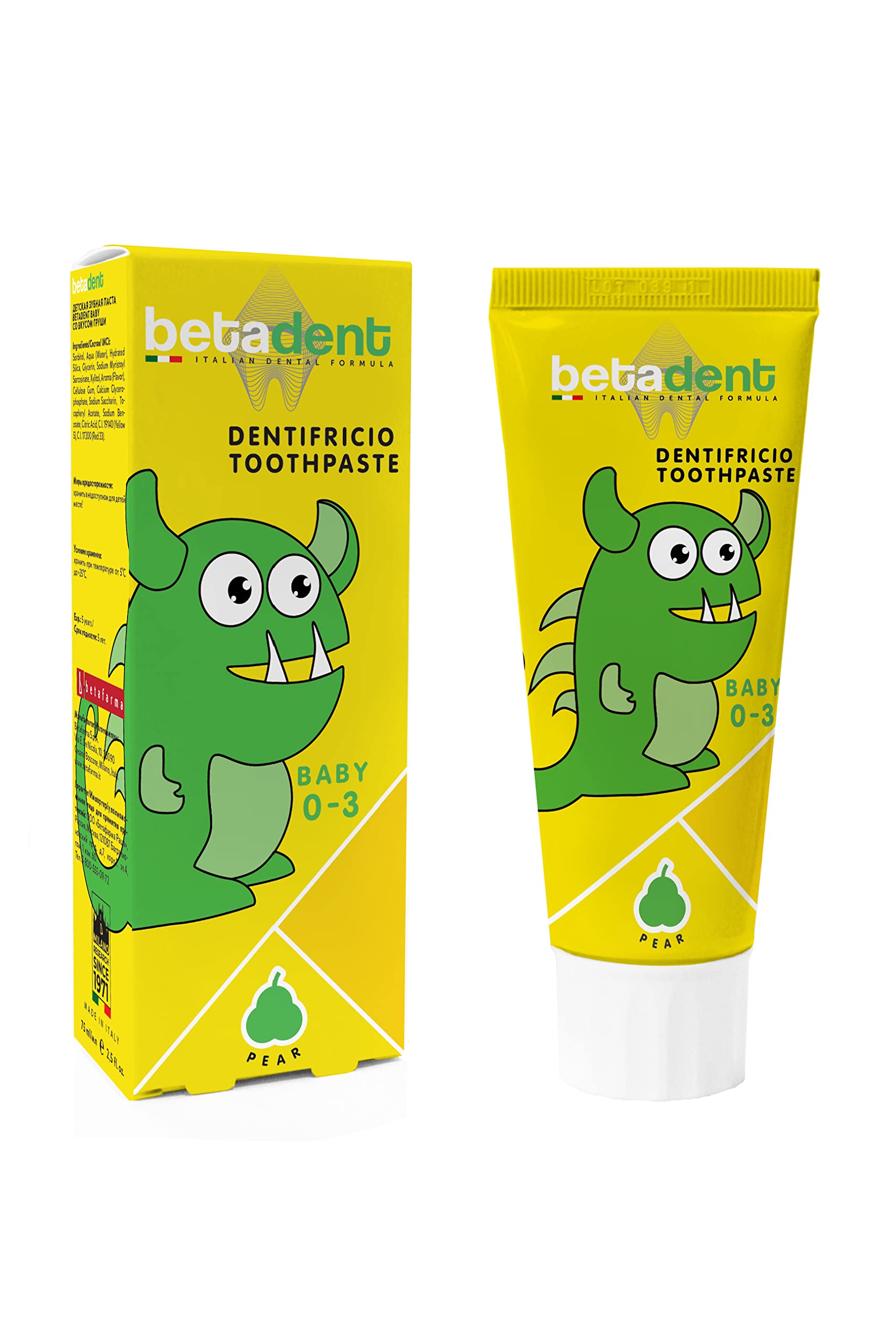 BETADENT Betadent Baby Toothpaste for Children 0-3 Years Old. Fluoride-Free. Pear Flavor. Anti-plaque action promotes healthy teething. Natural formula - 75 ml