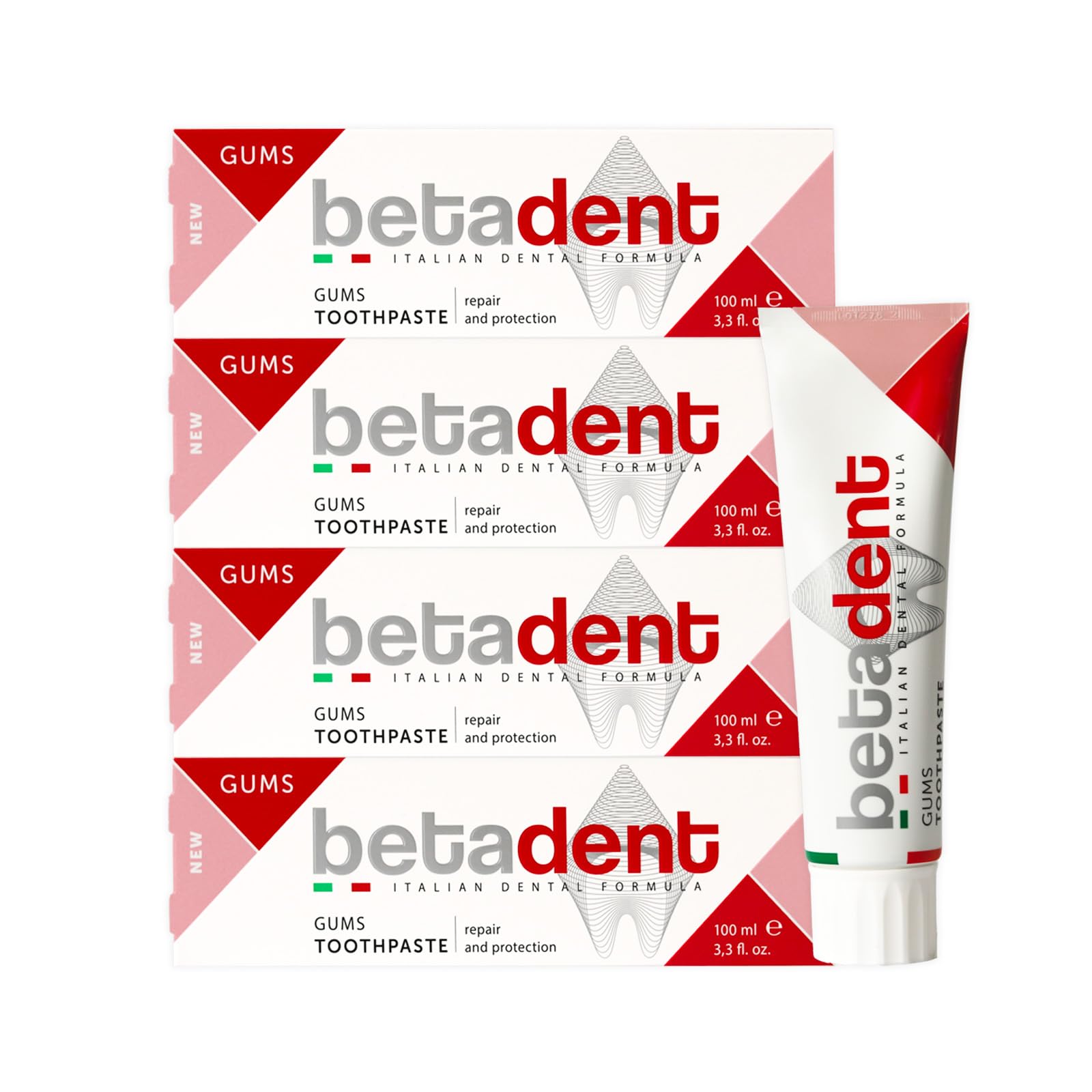 BETADENT Betadent GUMS TOOTHPASTE KIT for sensitive inflamed and irritated gums - Repairs and protects - Anti-plaque and antibacterial action - Delicate non-abrasive formula - 4 x 100 ml