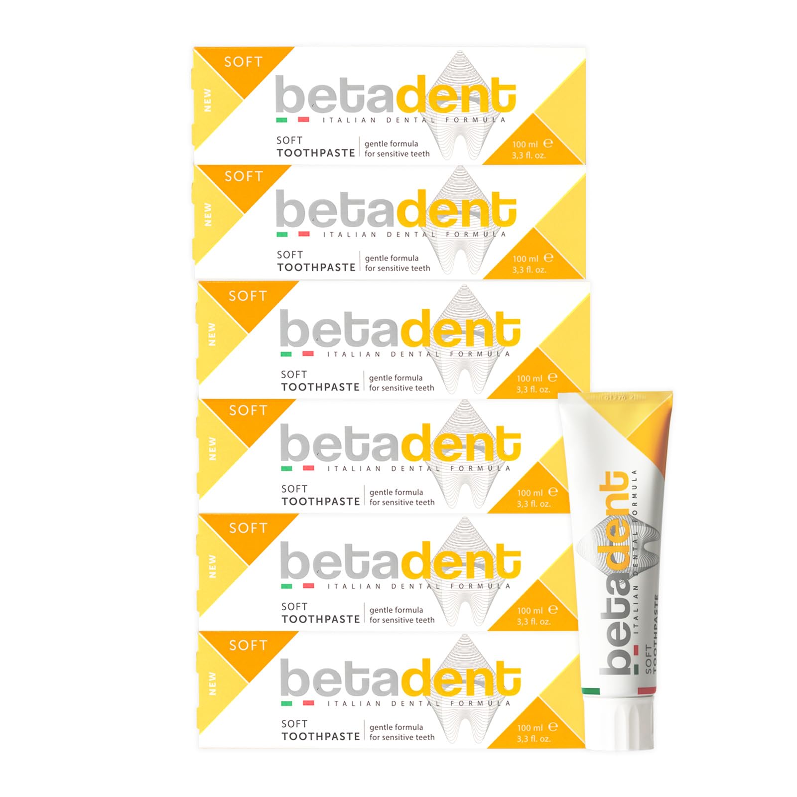 A toothpaste with a gentle, non-abrasive formula, specially designed and dosed for sensitive teeth and gums, providing effective daily cleaning and hygiene. Contains Bisabolol (derived from chamomile) and potassium salts. Large 100ml bottle, high quality. 100 made in Italy. INSTRUCTIONS FOR USE Apply a small amount of toothpaste to your toothbrush and brush. It is recommended to brush your teeth after each meal, at least twice a day. SAFETY WARNING For external use only. Do not swallow. Keep out of reach of children. Discontinue use and consult a dentist if irritation occurs. See more100 Made in Italy: Designed, formulated, and manufactured at the Betafarma S.p.A. factory in Cesano Boscone (MI). Directions for use: Apply a small amount of toothpaste to your toothbrush and brush. It is recommended to brush your teeth after each meal, at least twice a day. Bisabolol from chamomile has soothing and calming properties on the tissues of the golden pharyngeal cord, while potassium salts help remineralize teeth, essential for reducing sensitivity, gum irritation, and painful sensations. The gentle, non-abrasive formula controls gum irritation and prevents cavities, providing effective cleaning and daily hygiene. This toothpaste is specially formulated to treat sensitive teeth and inflamed gums.Betadent KIT 6 DENTIFRICE SOFT pour dents sensibles.Contraste l'inflammation gingivale.Action désinfectante et apaisante.Avec aloe vera, huile de thé et ingrédients naturels. 6 x 100 mlDESCRIPTION DU PRODUIT DESCRIPTION DU PRODUIT Un dentifrice à la formule délicate et non abrasive, spécialement étudié et dosé pour les dents et les gencives sensibles et pour effectuer une bonne action de nettoyage et d'hygiène quotidienne contenant du Bisabolol (dérivé de la camomille) et des sels de potassium. Format maxi taille 100 ml, haute qualité. 100 fabriqué en Italie. MODE D'EMPLOI Appliquer une petite quantité de dentifrice sur la brosse à dents et procéder au brossage. Il est recommandé de nettoyer les dents après chaque repas, au moins deux fois par jour. AVERTISSEMENT DE SÉCURITÉ Reservé à l'usage externe. Ne pas avaler. Conserver hors de portée des enfants. Arrêter l'utilisation et consulter un dentiste si irritation. Voir plus100 fabriqué en Italie : conçu, formulé et fabriqué dans l'usine de Betafarma S.p.A à Cesano Boscone (MI). Mode d'utilisation : appliquer une petite quantité de dentifrice sur la brosse à dents et procéder au brossage. Il est recommandé de nettoyer les dents après chaque repas, au moins deux fois par jour. Le Bisabolol de la camomille a des propriétés apaisantes et apaisantes sur les tissus du cordon doré-pharyngique, tandis que les sels de potassium aident à la reminéralisation des dents, essentiel pour réduire la sensibilité, les irritations des gencives et les sensations douloureuses. Formule délicate, non abrasive, qui contrôle les irritations des gencives et prévient la formation de caries, pour une bonne action de nettoyage et d'hygiène quotidienne. Dentifrice étudié spécialement pour traiter les dents sensibles et les gencives enflammées.