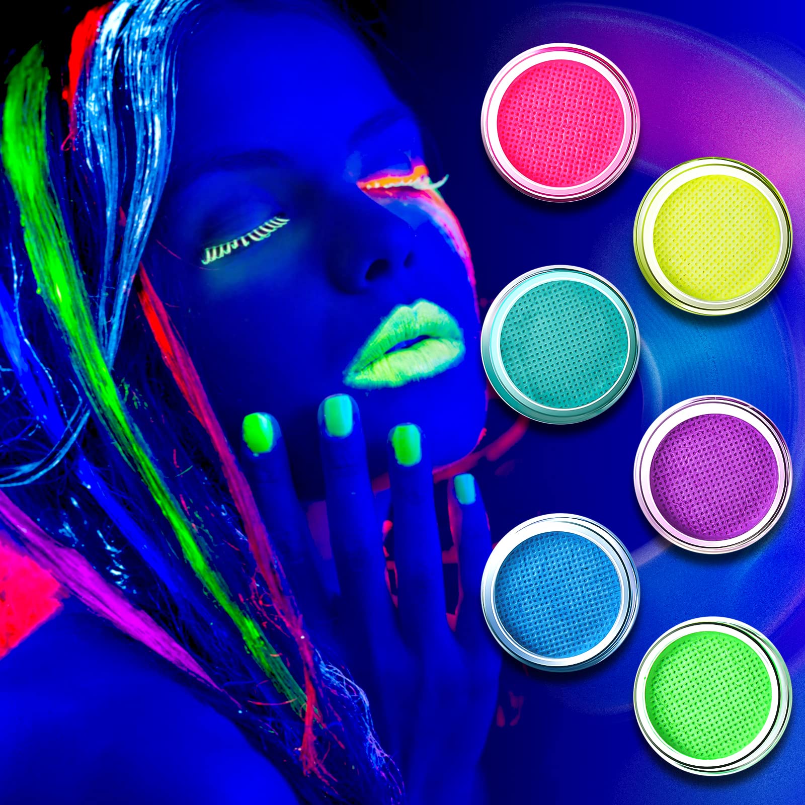 Safe for skin: Our makeup has been tested and proven on human skin to cause no harm, so you can safely apply it anywhere on your body. You should consult your doctor before using any of our products. Great for raves and festivals: Express yourself at any great club, rave, or Halloween party, and anywhere with UV lighting. These are vibrant colors that last all day, meaning they're visible even in natural light. But for double shots, try it under black light. Easy to use and wash off: Apply to your eyelid or body using a little water on a brush to activate the pressed powder. Use a damp makeup brush to blend the product until you achieve a creamy texture. You can remove the look simply by washing the makeup with warm, soapy water. Multicolor Fun: Transform your body into an artistic masterpiece with 6 fantastic colors: hot pink, green, blue, purple, yellow, and turquoise. This eyeliner will make you stand out from the crowd. Glow in the Dark: These luminous eyeliner shades glow under UV and black light. Smudge-proof and Transfer-proof: Your color won't fade until removed.