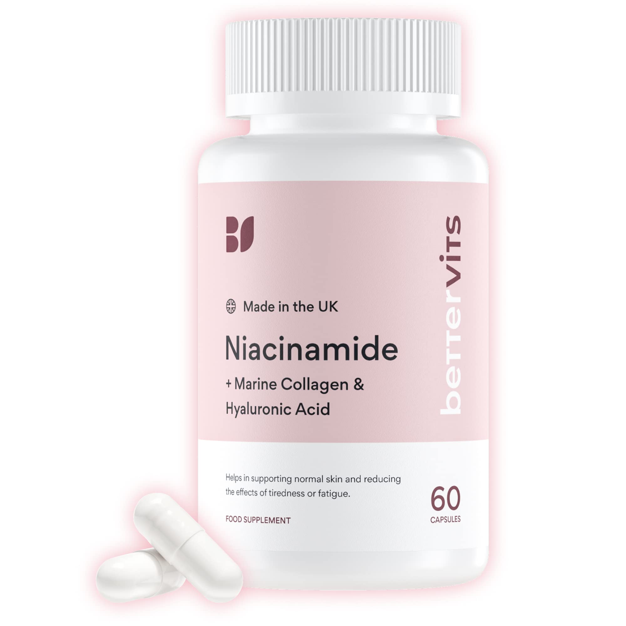 WHY BETTERVITS?: We are one of the UK's fastest growing supplement brands and for good reason. We deliver contemporary formulas which are locally made in the UK from start to finish. So you can rely on nutrition made with high quality ingredients and passion. EASY TO SWALLOW: We use the smallest possible size capsules in a slippery vegan friendly capsule shell to make it as easy as possible to swallow while maintaining a robust formula. LOVE YOUR SKIN: This fast acting formula delivers a range of nutrients that helps replenish lost collagen. From the age of 25, collagen levels begin to drop and this leads to wrinkling, dry and dull skin. HIGHEST QUALITY COLLAGEN: Feel the difference with a formula targeted for your skin. Our formula is made with a potent dose of Hydrolysed Marine Type 1 Collagen, which can help restore firmness, glow and health to ageing skin. FULL SKIN COVERAGE: With Niacinamide, Marine Collagen, Hyaluronic Acid, you get 3 powerful ingredients which are the gold standard of modern day skincare. No need for serums or lotions which may irritate the skin, this capsule delivers potent nutrition to restore your skin.