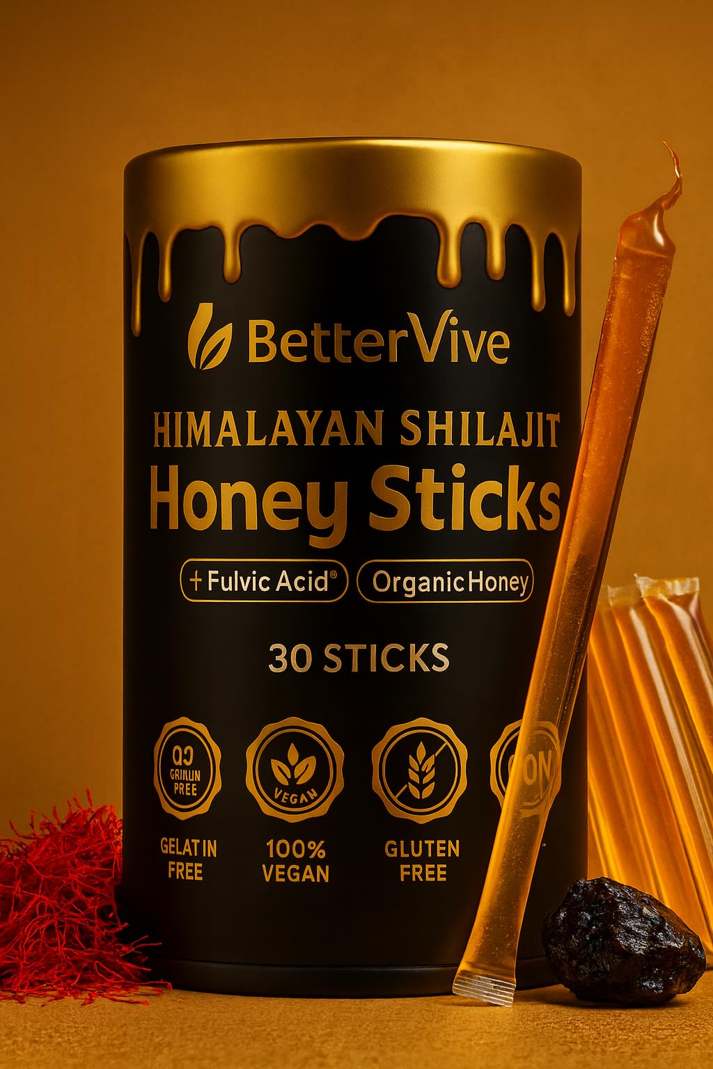 Unlock Ancient Himalayan Vitality with BetterViVe Pure Himalayan Shilajit Sticks – a premium blend of shilajit resin, organic honey, and saffron for maximum bioavailability and benefits. Sourced from the untouched Himalayan mountains, our lab-tested shilajit delivers 85 essential trace minerals and over 75 fulvic acid, known for its powerful energy, immune, and cognitive support. Unlike traditional sticky resin, BetterViVe Shilajit Sticks are pre-measured and easy to consume. Simply take one stick daily, mix it with warm water or tea, or enjoy it directly for a natural energy boost. Our organic honey saffron infusion not only enhances the taste but also amplifies the absorption of nutrients, making it an effortless addition to your wellness routine. ✓ 100 Natural Lab-Tested ✓ No Artificial Fillers or Preservatives ✓ Convenient Single-Serve Sticks for Daily Use Reclaim your energy, stamina, and overall well-being with BetterViVe Shilajit Sticks – your daily superfood for vitality and strength.✓ Lab-Tested 100 Natural – No fillers, no additives, just pure, high-potency trace mineral rich Himalayan shilajit combined with nature's best ingredients. ✓ Convenient Easy to Use – Unlike traditional shilajit resin, our pre-measured single-serve sticks make it easy to consume anytime on-the-go, anywhere, caffeine-free, daily dose – just mix with warm water, tea, or take directly. ✓ Immune Cognitive Support – Rich in antioxidants and essential minerals, this ancient superfood supports immune health, brain function, and overall well-being. ✓ Powerful Energy Stamina Booster – With 85 trace minerals and 75 fulvic acid, our shilajit helps support natural energy levels, stamina, and endurance. Works on immune support, vitality stamina. ✓ Infused with Organic Honey Saffron – A unique blend of raw honey and premium saffron enhances absorption, taste, and benefits. No harsh aftertaste, just natural goodness!. ✓ Organic Himalayan Shilajit – Natural energy booster sourced from the high-altitude Himalayan mountains, our pure shilajit resin is packed into convenient sticks for on-the-go vitality.