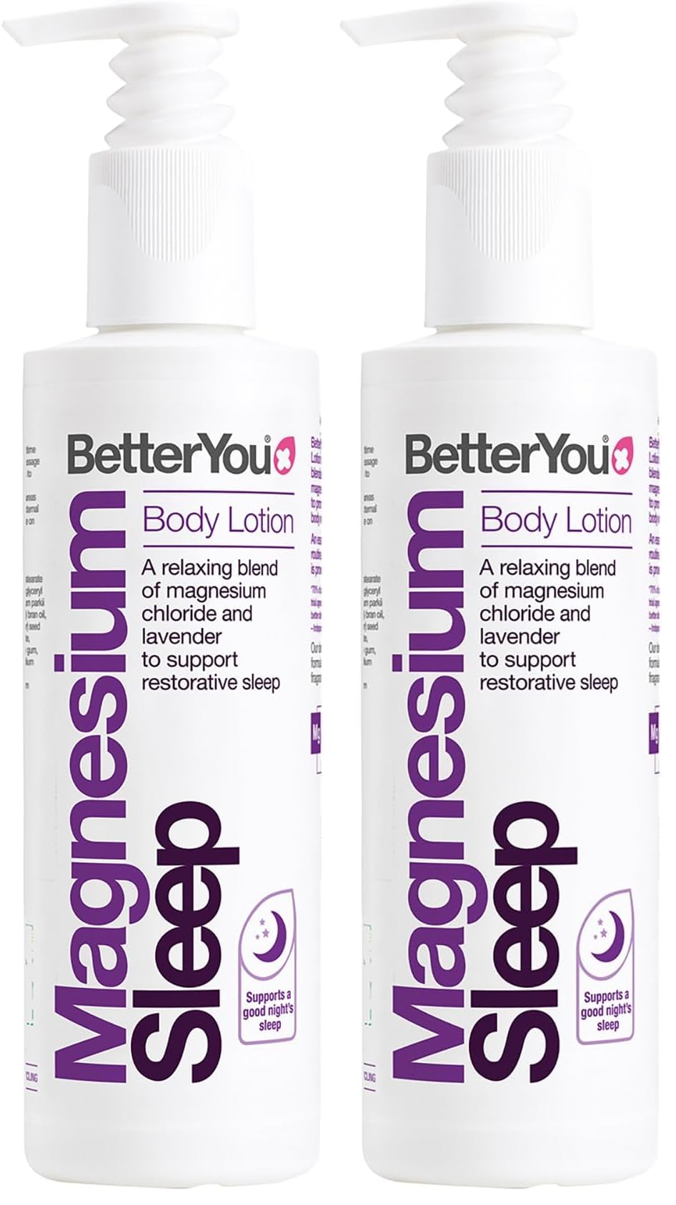 BETTER PLANET, BETTER YOU. BetterYou uses planet-friendly plastics and 100 recyclable packaging across our entire range of products. And, this body lotion formula is dermatologically tested, vegan, palm oil, and palm oil-derivative free. EASY, INSTANT SLEEP SUPPORT. Make this topical sleep solution part of your nightly routine, to promote mental relaxation and skin hydration. This fast-absorbing formula effortlessly penetrates the skin, priming your body for a restful night's sleep. SOOTHE MUSCLES, QUIET THE MIND. This sleepy lotion works to ease tired muscles, slow sensory activity, and calm the mind, facilitating a restful, uninterrupted sleep cycle, with Zechstein Magnesium that topically delivers full-body relaxation. THE MINERAL FOR MODERN LIFESTYLE. At BetterYou, we've harnessed the healing power of Magnesium Chloride. A key player in over 300 vital bodily functions, it's your secret weapon for stress management, energy, relaxation, recovery, and restful sleep. NIGHTTIME TRANQUILITY. Elevate your bedtime routine with Magnesium Sleep Body Lotion. This unique blend of Zechstein magnesium chloride and soothing essential oils lavender and chamomile, creates a calming sensation when massaged onto the skin. The information below is per-pack only.
