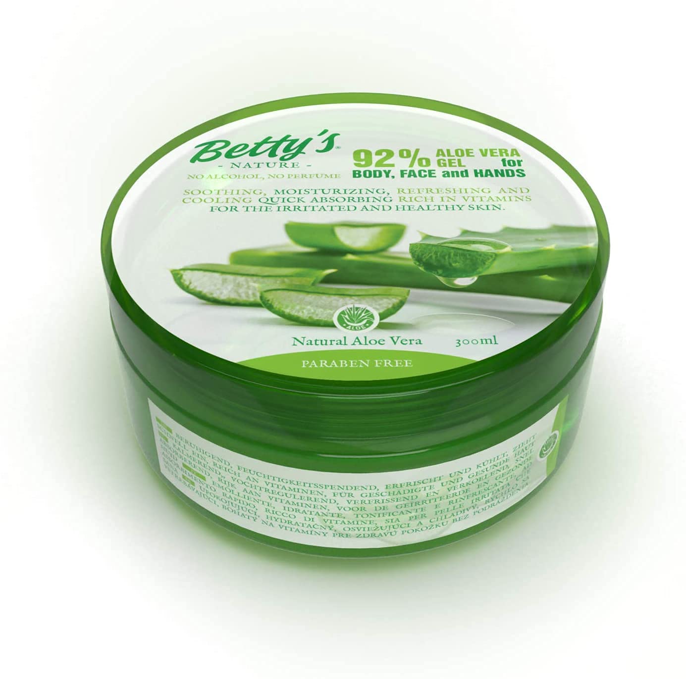 Betty's Nature Hand and Body Cream. A natural product rich in echinacea plant extract, aloe vera, and vitamin E. Apply generously to the skin. Repeat as often as desired. Suitable for use all over the body. 100 natural aloe vera ingredients – helps adjust the skin's oil and water balance, minimize pores, replenish nutrients, and prevent moisture and nutrient loss, leaving skin soft and smooth. It keeps your face moisturized and reduces blemishes, sunburn, acne, and scars. Can be used as a face cream, eye cream, mask, or body lotion.Ingredients: water, glycerin, ethylhexyl palmitate, stearic acid, cetearyl alcohol, echinacea angustifolia extract, aloe barbadensis leaf extract, chrysantellum indicum extract, hamamelis vi. brand Betty.Gel d'aloe vera - Crème de soin de la peau sans lavage - 300 gDESCRIPTION DU PRODUIT Betty's nature Crème pour les mains et le corps Produit naturel riche en extraits de plante d'échinacée, aloe vera et vitamine E. Appliquer généreusement sur la peau pour l'application. Répétez autant de fois que vous le souhaitez. Convient pour une utilisation sur tout le corps. Ingrédients 100 naturels d'aloe vera - Convient pour ajuster l'équilibre de l'eau et de l'huile, rétrécir les pores, reconstituer les nutriments de la peau et éviter la perte d'hydratation et de nutriments de la peau, rend la peau douce et lisse. Cela maintient votre visage hydraté et réduit les impuretés, les coups de soleil, l'acné, les cicatrices. Peut être utilisé comme crème pour le visage, crème pour les yeux, masque, corps.Ingrédients : eau, glycérine, palmitate d'éthylhexyle, acide stéarique, alcool cétéarylique, extrait d'échinacée angustifolia, extrait de feuille d'aloe barbadensis, extrait de chrysantellum indicum, hamamelis vi. Marque Betty.