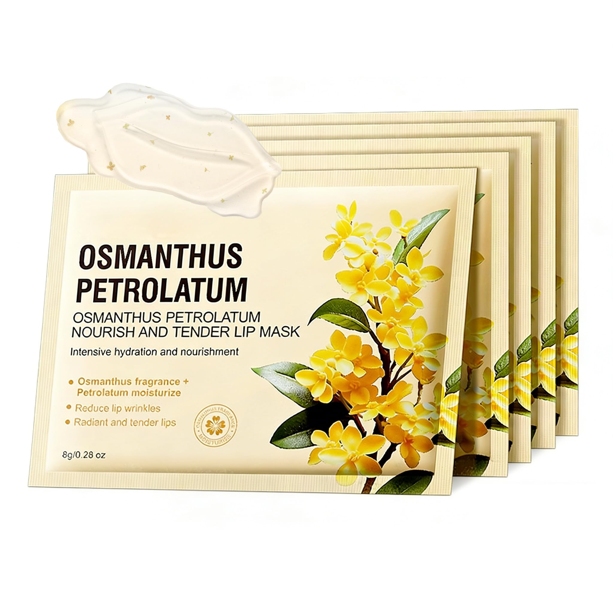 [INTENSIVE LIP MASK REPAIR]Wake up to soft, smooth, and supple lips with the treatment lip mask. This rich lip repair mask for dry chapped lips deeply nourishes and restores moisture, softens rough texture, and reduces dullness and fine lines. Great self-care gifts for women. [ON-THE-GO LIP CARE]Each pack contains individually wrapped lip masks, making it easy to hydrate your lips wherever you are. Whether you're at home or on the go, these travel-friendly masks keep your lips feeling soft and refreshed. [NOURISHED LIPS ALL DAY]Our lip treatment mask locks in moisture, keeping your lips soft, smooth, and nourished for hours. It's an essential part of your daily routine, non-greasy and gentle, and revitalized with every use. [KEY INGREDIENT] Ultra moisturizing lip mask is formulated with glycerin and aloe extract, effective in providing rich moisturization and firming effects, making the lips tender, soft, and radiant. Also, the subtle fragrance of osmanthus and sweet flavor uplift your mood. [MOISTURE LIPS IN MINUTES]Osmanthus Petrolatum Lip Mask hydrates and enhances your lips in just 5 minutes. It's a great way to quickly rejuvenate your lips, leaving them feeling smooth, plump, and nourished. The moisturizing mask is a must for dry, chapped lips that need a boost of moisture and softness.