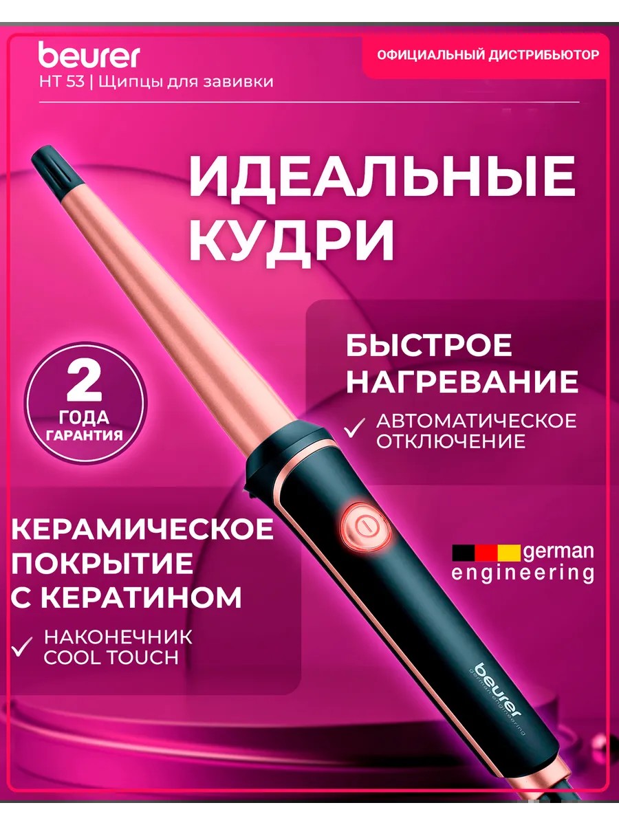 Beurer HT 53 Curling Iron. Create soft, voluminous, or classic curls. This curling iron creates soft curls thanks to its 13-25 mm conical tip. Fast heating, maximum temperature of approximately 200°C. Automatic shut-off after 30 minutes.