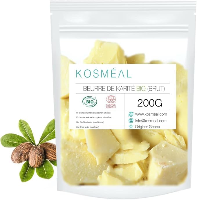 : Discover our organic raw shea butter, presented in a convenient 100g eco-pack. This natural skincare product boasts two prestigious certifications: COSMÉ BIO and Ecocert, guaranteeing its quality and organic origin. Ideal for moisturizing and nourishing your skin, this pure shea butter is part of an environmentally conscious approach thanks to its eco-friendly packaging. Its rich texture and purity make it a valuable addition to your daily skincare routine. Ingredients: Butyrospermum Parkii ButterPure Texture: Raw, unrefined shea butter retains all its natural properties and essential vitamins. Versatile Use: Perfect for the face, body, hair, and very dry areas such as elbows and heels. Convenient Size: Eco-friendly 100g packaging, ideal for daily use and respectful of the environment. Intense Hydration: Deeply nourishes dry skin, restores elasticity, and protects against external aggressors. Organic Quality: 100 natural and organic shea butter, certified by COSMÉ BIO and Ecocert, guaranteeing optimal purity.Description du produit Découvrez notre beurre de karité brut biologique, présenté dans un éco-pack pratique de 100g. Ce produit naturel pour le soin de la peau bénéficie d'une double certification prestigieuse : COSMÉ BIO et Ecocert, garantissant sa qualité et son origine biologique. Idéal pour hydrater et nourrir votre peau, ce beurre de karité pur s'inscrit dans une démarche respectueuse de l'environnement grâce à son conditionnement éco-responsable. Sa texture riche et sa pureté en font un allié précieux pour votre routine de soin quotidienne. Ingrédients Butyrospermum Parkii ButterTexture Pure: Beurre brut non raffiné conservant toutes ses propriétés naturelles et ses vitamines essentielles. Polyvalence d'Usage: Parfait pour le visage, le corps, les cheveux et les zones très sèches comme les coudes et les talons. Format Pratique: Conditionnement éco-responsable de 100g, idéal pour une utilisation quotidienne et respectueux de l'environnement. Hydratation Intense: Nourrit en profondeur la peau sèche, restaure l'élasticité et protège contre les agressions extérieures. Qualité Bio: Beurre de karité 100 naturel et biologique, certifié COSMÉ BIO et Ecocert, garantissant une pureté optimale.Beurre De Karité Brut BIO Éco-Pack 200G Certifié COSMÉ BIO et Ecocert