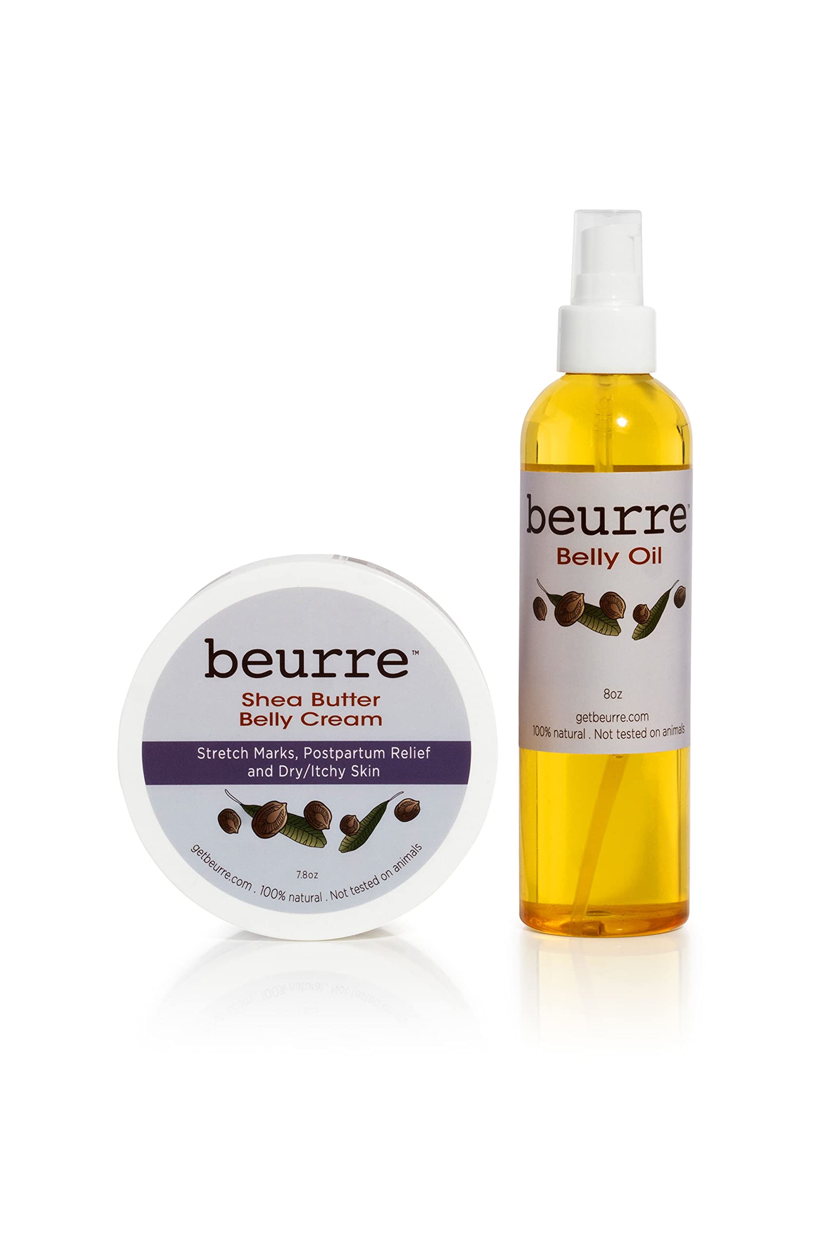 COLLECTION INCLUDES: Beurre Shea Butter Belly Cream Beurre Shea Butter Belly Oil. KEY INGREDIENTS: Our Fair Trade Shea Butter is the perfect natural solution to eczema flare ups. Its fatty acids lubricate and hydrate dry skin, while vitamins A and E help repair damaged skin. No artificial preservatives included. LEAPING BUNNY APPROVED: NO ANIMAL TESTING. NO PARABENS. NON-TOXIC. CRUELTY-FREE. VEGAN. WHAT IT'S GOOD FOR: Combats nipple chafing and stretch marks Perfect for new and expecting mama, Great self soothing rituals. Composed of naturally derived ingredients like shea butter, jojoba oil, and calendula, our Mama Bundle is a luxurious relaxation recipe for your mama, sister, or best friend. Apricot kernel oil and shea oil combine to reduce stretch marks and heal chapped nipples, making Beurre Belly Oil safe for everyday use and ideal for new moms.