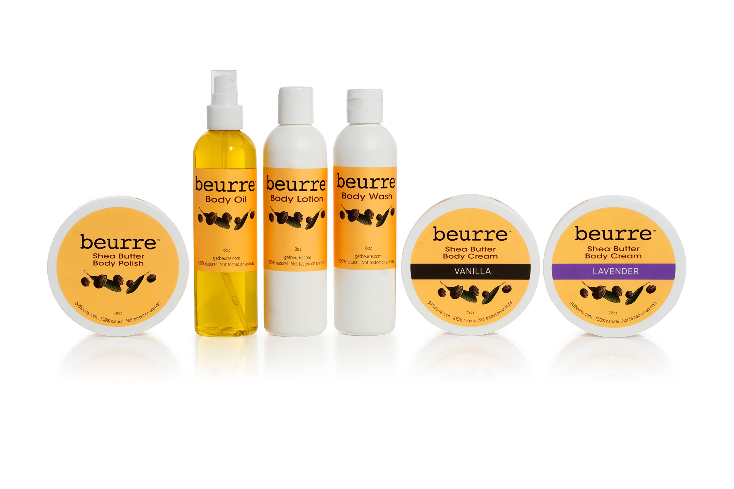 BODY WASH: Beurre Shea Butter Body Wash is a luxurious blend of shea butter, aloe vera and herb infused oils designed to moisturize, hydrate and soften your skin. BODY LOTION: SIMPLICITY IS BEST! Beurre Body Lotion is a fragrance free formula that glides right on skin, protecting it with key vitamins. Our signature shea butter body cream is made with Fair Trade Ghanian Shea Butter that softens purifies dry skin. Blended with shea butter and skin quenching oils this combination hydrates moisturizes your skin. BODY SCRUB: DECADENT grapeseed oil derived from Italy and nature's favorite exfoliant, sugar, Beurre Body Polish scrubs away dead skin while helping promote circulation to the skin surface. In the shower or bath, scoop a generous amount of Beurre Body Polish out of the jar and massage on your skin in a circular motion. Rinse away to reveal silky smooth glowing skin. Use every 2-3 days to enjoy soft skin. For sensitive skin, use once a week. Store at room temperature in a dry space. BODY OIL : RESTORE REVITALIZE YOUR SKIN: Carefully crafted blends of restorative vitamin E, grapeseed and jojoba oils quench thirsty, dry skin. These oils are high in fatty acids to naturally create a healthy skin tone. Reduces wrinkles, softens and hydrates dry skin, helps reduce stretch marks scars. Great for baby bumps, post operative scarring and other skin conditions. BODY CREAM: WRAP YOUR BODY in warm, yummy vanilla with our shea butter body cream. Our signature body cream is rich with softening raw Fair Trade Ghanian Shea Butter and warm vanilla essence. Vanilla for calming Energizing, Skin-softening properties Fast absorbing.