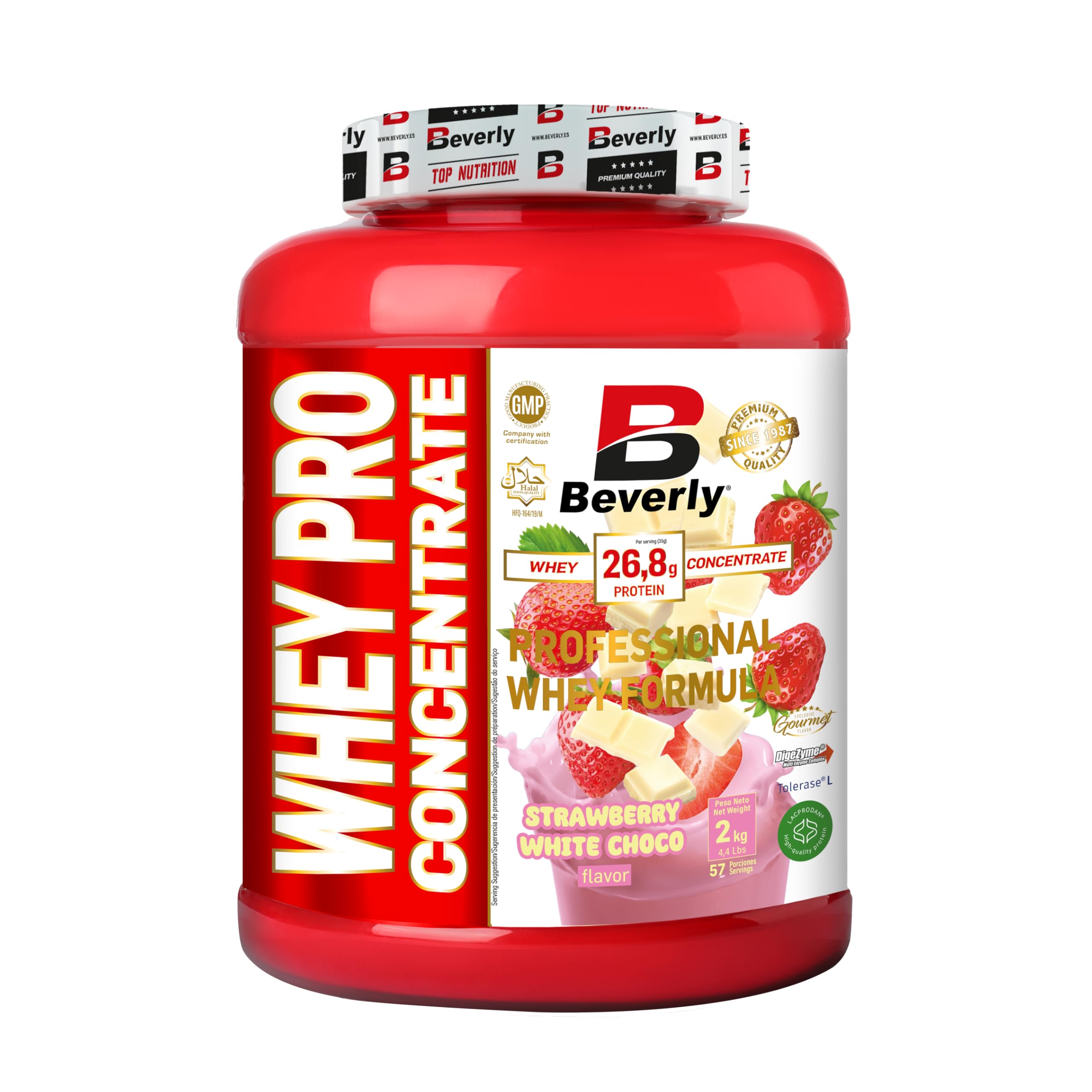Whey Pro Concentrate is an exclusive whey protein made with Lacprodan SP-8011, patented by Arla Foods Ingredients, considered one of the best whey proteins in the world. Whey Pro Concentrate is designed for more servings with the highest protein percentage: 57 servings, a two-month supply, and between 26g and 27g of the highest quality protein per serving. What is whey protein and what is it used for? Whey protein (whey concentrate) is a highly recommended protein for all types of athletes, especially those looking for a protein to preserve, regenerate, and increase their muscle mass. This type of protein is recommended for athletes who experience significant muscle loss, such as athletes, soccer players, cyclists, marathon runners, bodybuilders, CrossFit athletes, Ironman competitors, and in short, high-level athletes. Why is WHEY PRO CONCENTRATE the best protein? - Because it's made with 100 Lacprodan SP-8011 Instant from Arla Foods Ingredients, considered one of the world's best patented whey protein formulas. - Because we've added Tolerase L and Digezyme, which eliminate all traces of lactose and improve the product's digestibility and absorption. - Because we haven't limited ourselves to just one or two flavors, we offer eight delicious flavors (Butter Cookie, Custard, Vanilla, Belgian Chocolate, Choco-cookies, White Chocolate Strawberry, Strawberry, Banana) so you'll never get tired of our protein. - Because we don't add any extra ingredients that increase sugars, calories, or fats. A protein with no fillers, no added sugars. The highest quality protein. Because we provide you with between 26.4g and 27.4g of protein in each shake, depending on the flavor. Because we manufacture our products according to the strictest GMP and Halal quality standards. INGREDIENTS Lacprodan SP-8011 Instant Whey Protein Concentrate (emulsifier: soy lecithin), flavoring, salt, sweetener (sucralose), Digezyme enzyme complex (maltodextrin, amylase, cellulase, lactase, lipase, and protease), Tolerase L (lactase enzyme 100,000 ALU g). Defatted cocoa powder, beta-carotene, and beetroot powder (depending on flavor).WHEY PRO CONCENTRATE is manufactured according to the strictest GMP and Halal quality standards. WHEY PRO CONCENTRATE provides between 26.4g and 27.4g of protein per shake, depending on the flavor. WHEY PRO CONCENTRATE does not add any extra ingredients that increase sugars, calories, or fats. A protein with no fillers, no added sugars. Only the highest quality protein. WHEY PRO CONCENTRATE offers 8 delicious flavors (Butter Cookie, Custard, Vanilla, Belgian Chocolate, Choco-cookies, White Chocolate Strawberry, Strawberry, Banana) so you'll never get tired of our protein. WHEY PRO CONCENTRATE has been enriched with Tolerase L and Digezyme, which eliminate any trace of lactose and improve the digestibility and absorption of the product. WHEY PRO CONCENTRATE is made from 100 Lacprodan SP-8011 Instant from Arla Foods Ingredients, considered one of the world's finest patented whey proteins.Beverly Whey Pro - Concentré de protéines de lactosérum - 2 kg - 28 g de protéines par portion - 58 portions - Tonifie et augmente la masse musculaire - Saveur (FRAISE CHOCOLAT BLANC)DESCRIPTION DU PRODUIT DESCRIPTION DU PRODUIT WHEY PRO CONCENTRATE est une protéine de lactosérum exclusive fabriquée avec le Lacprodan SP-8011 breveté par Arla Foods Ingredients, considéré comme l'une des meilleures protéines de lactosérum au monde. WHEY PRO CONCENTRATE a été conçu pour un plus grand nombre de portions avec le pourcentage de protéines le plus élevé : 57 portions, emballage de deux mois et entre 26g et 27g de protéines de la plus haute qualité par portion. Qu'est-ce que la protéine de lactosérum et à quoi sert-elle ? La protéine de lactosérum (concentré de lactosérum) est une protéine fortement recommandée pour tous les types de sportifs, en particulier pour les athlètes qui recherchent une protéine pour préserver, régénérer et augmenter leur masse musculaire. Ce type de protéine est recommandé pour les sportifs à forte fonte musculaire tels que les athlètes, les footballeurs, les cyclistes, les marathoniens, les bodybuilders, le crossfit, l'Ironman, bref les sports de haut niveau. Pourquoi WHEY PRO CONCENTRATE est-elle la meilleure protéine ? -Parce qu'elle est composée à 100 de Lacprodan SP-8011 Instant d'Arla Foods Ingredients, considéré comme l'un des meilleurs brevets au monde pour la protéine de lactosérum. -Parce que nous avons ajouté Tolerase L et Digezyme qui éliminent toute trace de lactose et améliorent la digestibilité et l'assimilation du produit. -Parce que nous n'avons pas fait une ou deux saveurs, nous vous proposons 8 saveurs délicieuses (Biscuit au beurre, Crème anglaise, Vanille, Chocolat belge, Choco-cookies, Fraise au chocolat blanc, Fraise, Banane) pour que vous ne vous lassiez jamais de prendre notre protéine. -Parce que nous n'ajoutons pas d'ingrédients supplémentaires qui augmentent les sucres, les calories ou les graisses. Une protéine sans garniture, sans sucres ajoutés. Des protéines de la plus haute qualité. -Parce que nous vous fournissons entre 26,4 g et 27,4 g de protéines dans chaque shake, en fonction de la saveur. -Parce que nous fabriquons nos produits selon les normes de qualité GMP et Halal les plus strictes. INGRÉDIENTS Lacprodan SP-8011 Concentré instantané de protéines de lactosérum (émulsifiant : lécithine de soja), arôme, sel, édulcorant (sucralose), complexe enzymatique Digezyme (maltodextrine, amylase, cellulase, lactase, lipase et protéase), Tolerase L (enzyme lactase 100 000 ALU g). poudre de cacao dégraissé, bêta-carotène et poudre de betterave (selon les goûts).WHEY PRO CONCENTRATE est fabriqué selon les normes de qualité GMP et Halal les plus strictes. WHEY PRO CONCENTRATE apporte entre 26,4 g et 27,4 g de protéines par shake, en fonction de la saveur. WHEY PRO CONCENTRATE n'ajoute pas d'ingré