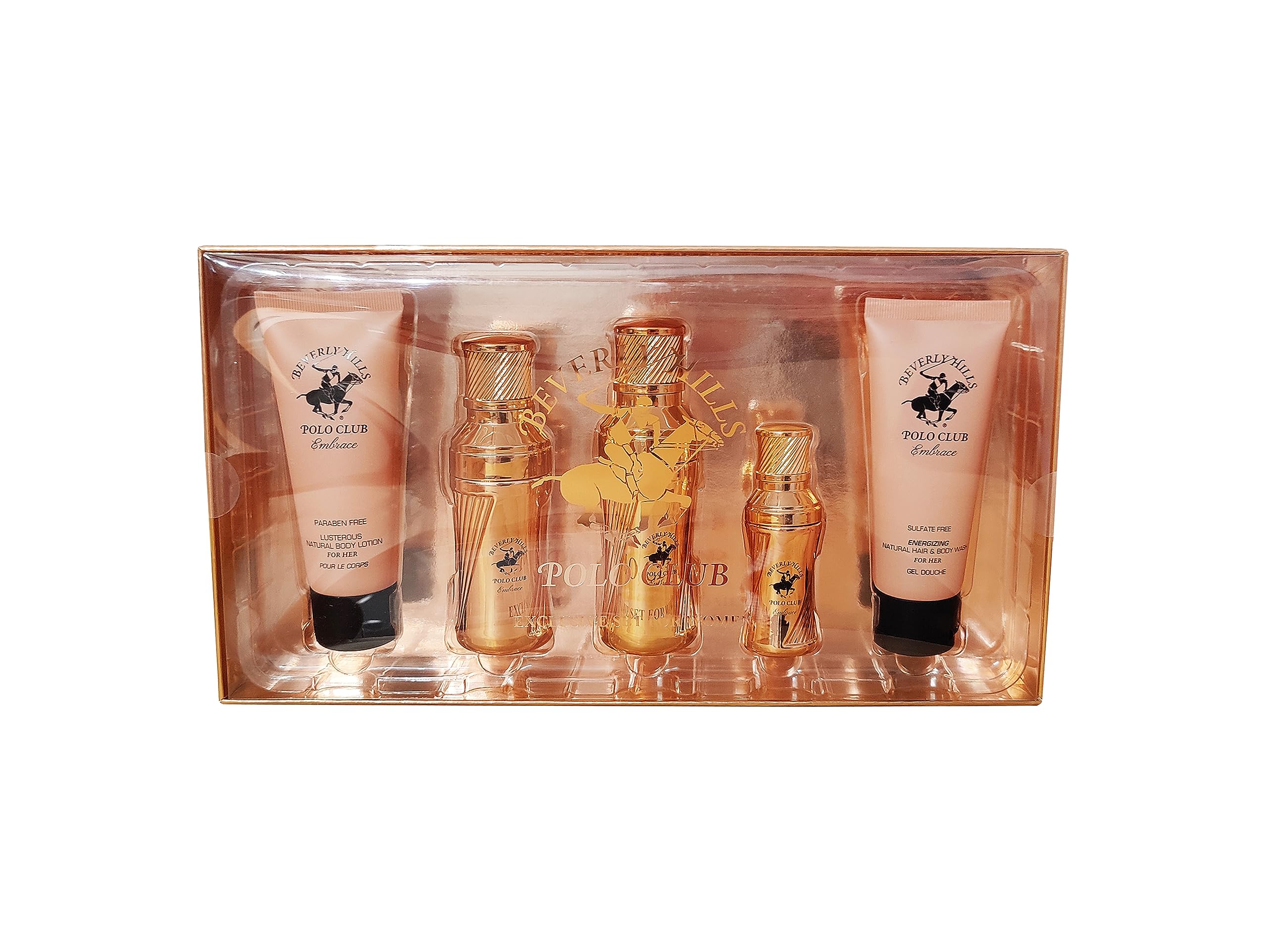 Beverly Hills Polo Club BHPC Embrace Women's Exclusive 5 Piece Set Fragrance Collection with Natural Body Lotion, Eau de Parfum (1.7oz and 0.5oz), and Hair Body Wash - Perfect Holiday Gift for Her