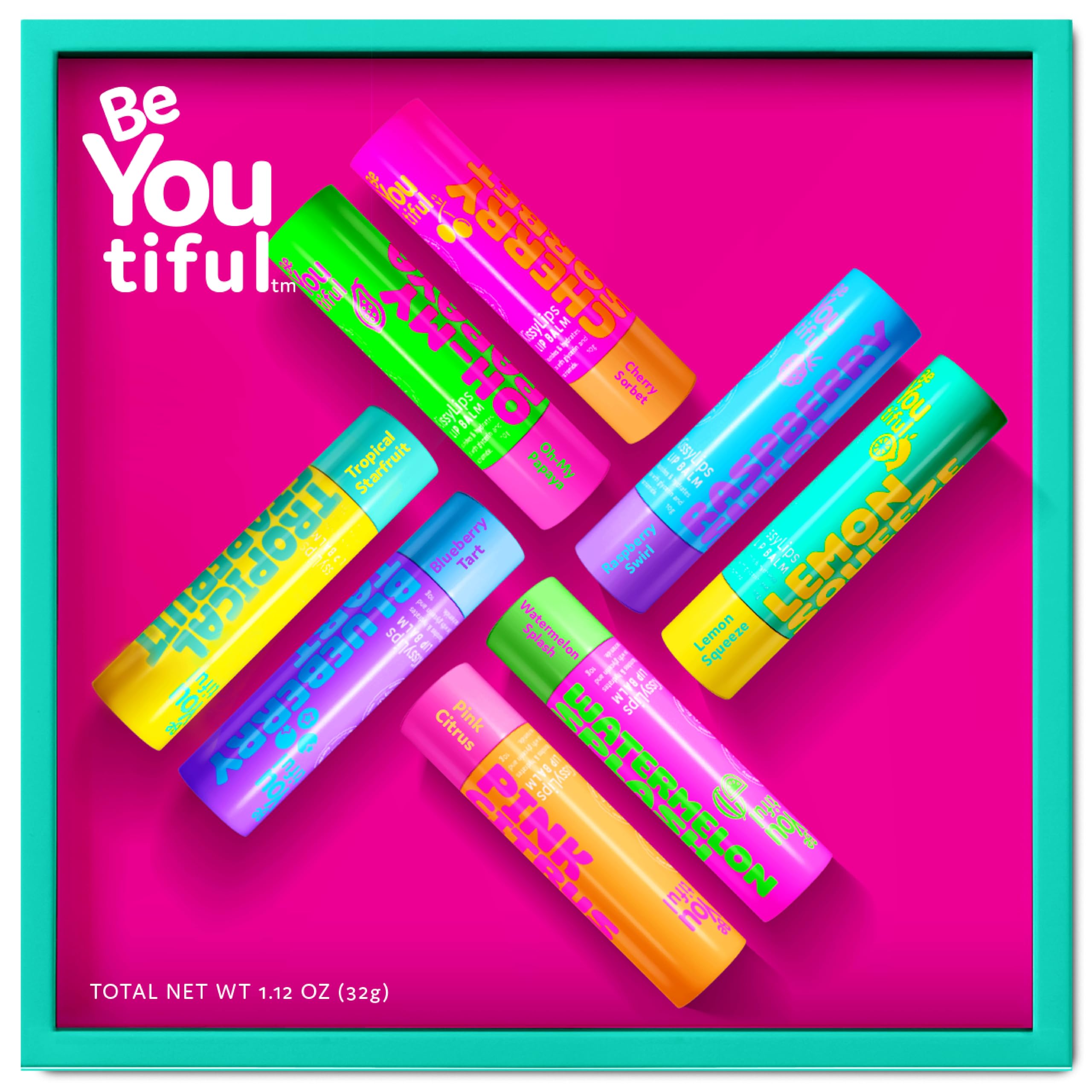 BeYoutiful Skincare Natural Lip Balm Set of 8 for Teens Valentines Day Basket Stuffers for Girls Shea Butter & Vitamin E 8 Fruity Flavors Gift Box for Kids Tweens Teens Lip Balm Gift Set