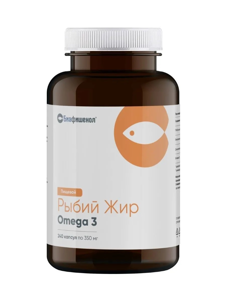 Biafishenol fish oil food n 240 capsules 0.35g. An additional source of polyunsaturated omega-3 fatty acids, vitamin D. As a biologically active food supplement. Fish oil (from anchovy), capsule shell (gelatin, water-retaining agent - glycerin, acidity regulator - citric acid), vitamin D3. For sale to the population as a biologically active food supplement - an additional source of vitamin D3, a source of polyunsaturated omega-3 fatty acids, including eicosapentaenoic and docosahexaenoic acids.
