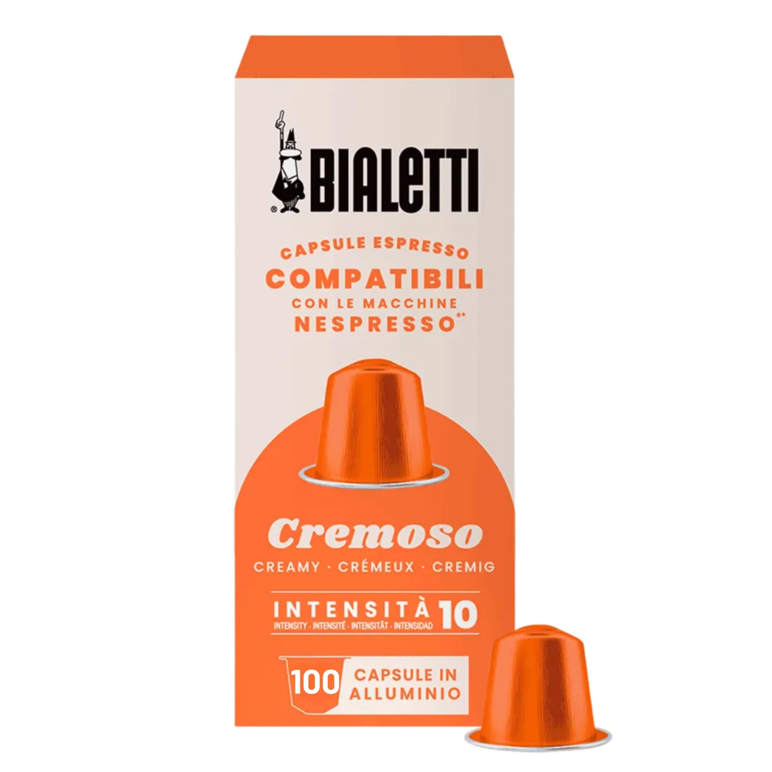 10 Boxes: 100 Coffee Capsules. Capsules compatible only with Nespresso brand machines for home use. A lingering blend with a smooth, fruity aftertaste, perfect for those who enjoy the aroma of hazelnut and dried fruit. Nespresso Cremoso compatible capsules contain a harmonious and refined espresso, characterized by a unique smoothness. Bialetti presents the new range of compatible capsules, perfect for rediscovering the full quality and experience of Bialetti coffee and the taste of true Italian espresso.