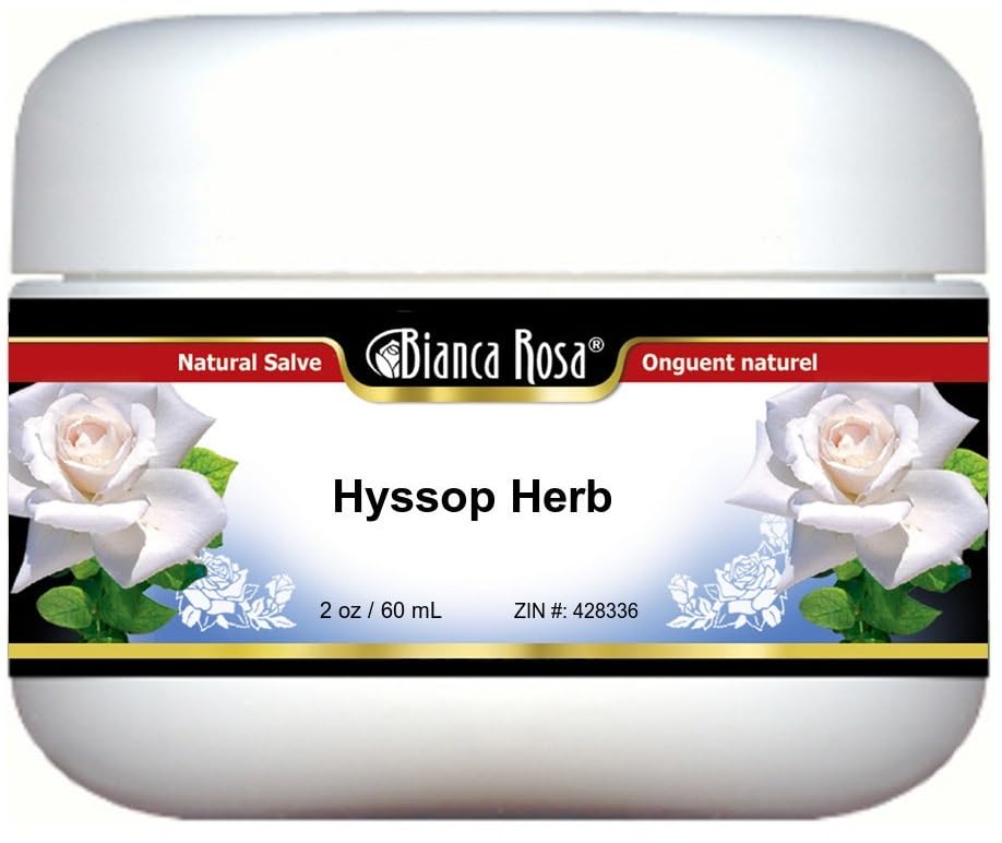 Hyssop Herb - Salve Ointment (2 oz, ZIN: 428336)Packaged in the United States in a GMP certified facility (Good Manufacturing Practice).No fillers.Manufacturer: Bianca RosaSize: 2 ozLuxurious Cream Base in a convenient salve jar.Ingredients: Beeswax, Benzoin (Preservative), Hyssop, Jojoba Oil, Lanette Wax (Emulsifier), Glycerin (Vegetable Source)