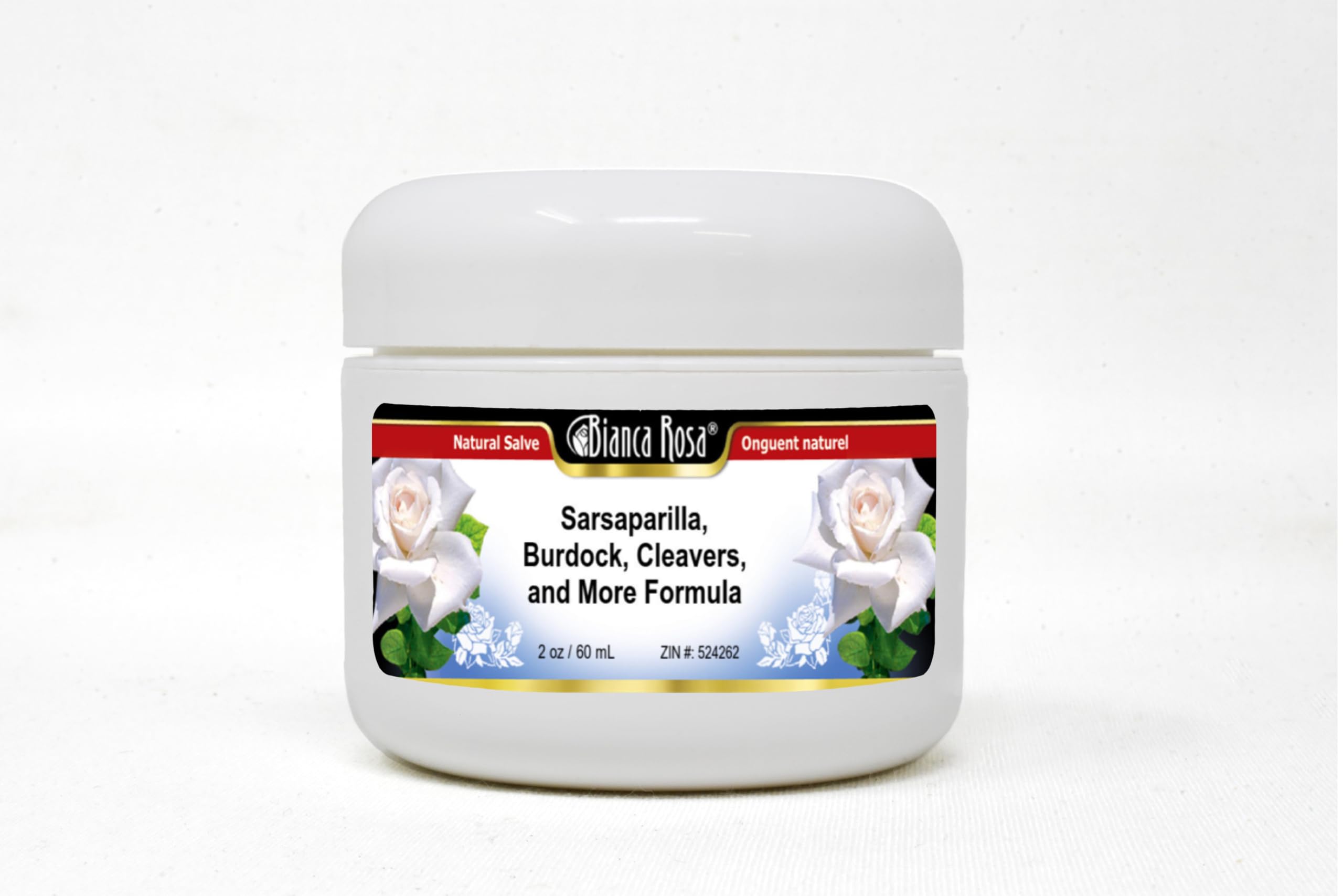 Sarsaparilla, Burdock, Cleavers, and More Formula Salve (2 oz, ZIN: 524262) Packaged in the United States in a GMP certified facility (Good Manufacturing Practice). No fillers. Manufacturer: Bianca Rosa Size: 2 oz Luxurious Cream Base in a convenient salve jar. Ingredients: Burdock, Dandelion, Sarsaparilla, Yellow Dock Root, Bedstraw (Cleavers), Beeswax, Benzoin (Preservative), Jojoba Oil