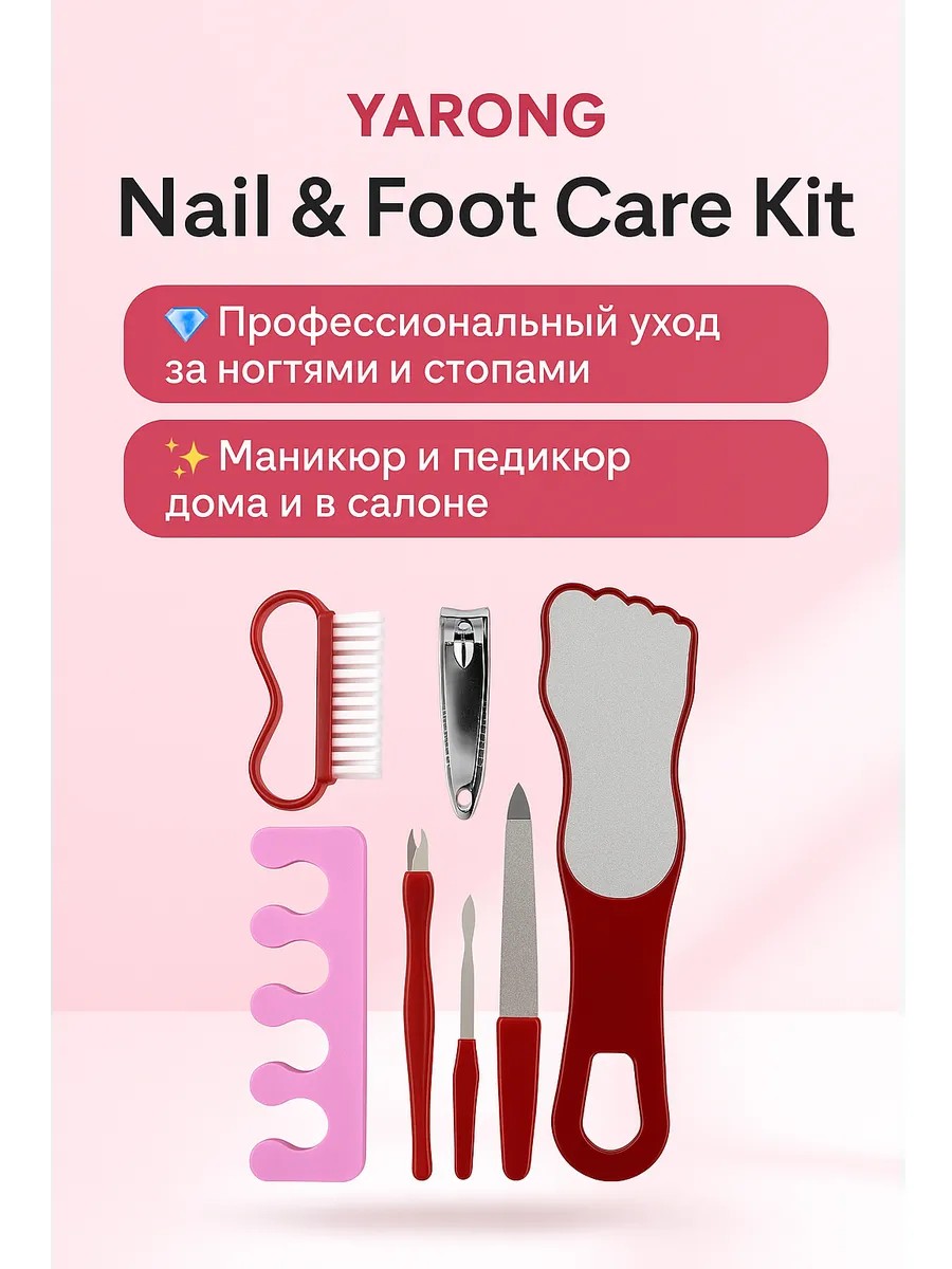 Набор для педикюра и маникюра YARONG Nail & Foot Care Kit – это универсальный комплект инструментов для ухода за ногтями и стопами в домашних условиях. В набор входят: пилка для ногтей, щетка для очистки, кусачки, палочка для кутикулы, разделитель для пальцев и терка для стоп.