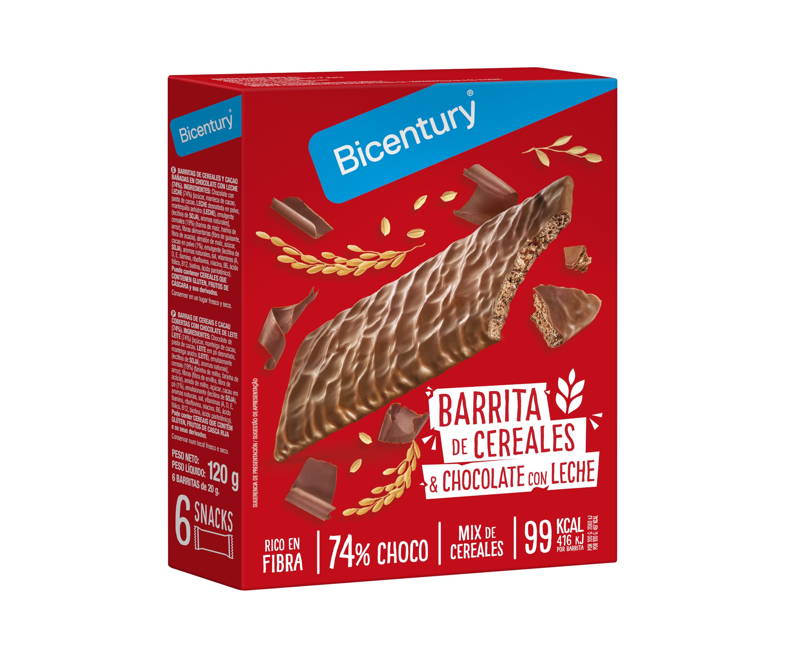 Ingredients: Cereal and cocoa bars dipped in milk chocolate (74 ). Ingredients: Milk chocolate (74 ) [sugar, cocoa butter, cocoa mass, skimmed milk powder, anhydrous butter (MILK), emulsifier (soy lecithin), flavorings], cereals (18 ) (corn flour, rice flour), dietary fiber (pea fiber, acacia fiber), corn starch, sugar, cocoa powder (1 ), emulsifier (soy lecithin), flavorings (contains lactose), salt, vitamins (A, D, E, B1, B2, B3, B6, B9-folic acid, B12, biotin, pantothenic acid). May contain cereals containing gluten, nuts, and their derivatives. Since this product's composition may change slightly over time, we strongly recommend that you check the product labeling upon receipt, especially in the case of food allergies or intolerances or specific composition requirements.Ingrédients Barres de céréales et de cacao trempées dans du chocolat au lait (74 ). Ingrédients : chocolat au lait (74 ) [sucre, beurre de cacao, pâte de cacao, lait écrémé en poudre, beurre anhydre (LAIT), émulsifiant (lécithine de soja), arômes], céréales (18 ) (farine de maïs, farine de riz), fibre alimentaire (fibre de pois, fibre d'acacia), amidon de maïs, sucre, poudre de cacao (1 ), émulsifiant (lécithine de soja), arômes (contient du lactose), sel, vitamines (A, D, E, B1, B2, B3, B6, B9-acide folique, B12, biotine, acide pantothénique). Peut contenir des céréales contenant du gluten, des fruits à coque et leurs dérivés. Étant donné que ce produit pourrait voir sa composition légèrement modifiée au fil du temps, nous vous recommandons fortement de vérifier l'étiquetage du produit à sa réception, en particulier en cas d'allergies ou d'intolérances alimentaires ou d'exigences spécifiques au niveau de la composition.Bicentury - New products - Petite barre énergétique Bicentury Sarialis Chocolat au lait Céréales (6 uds)