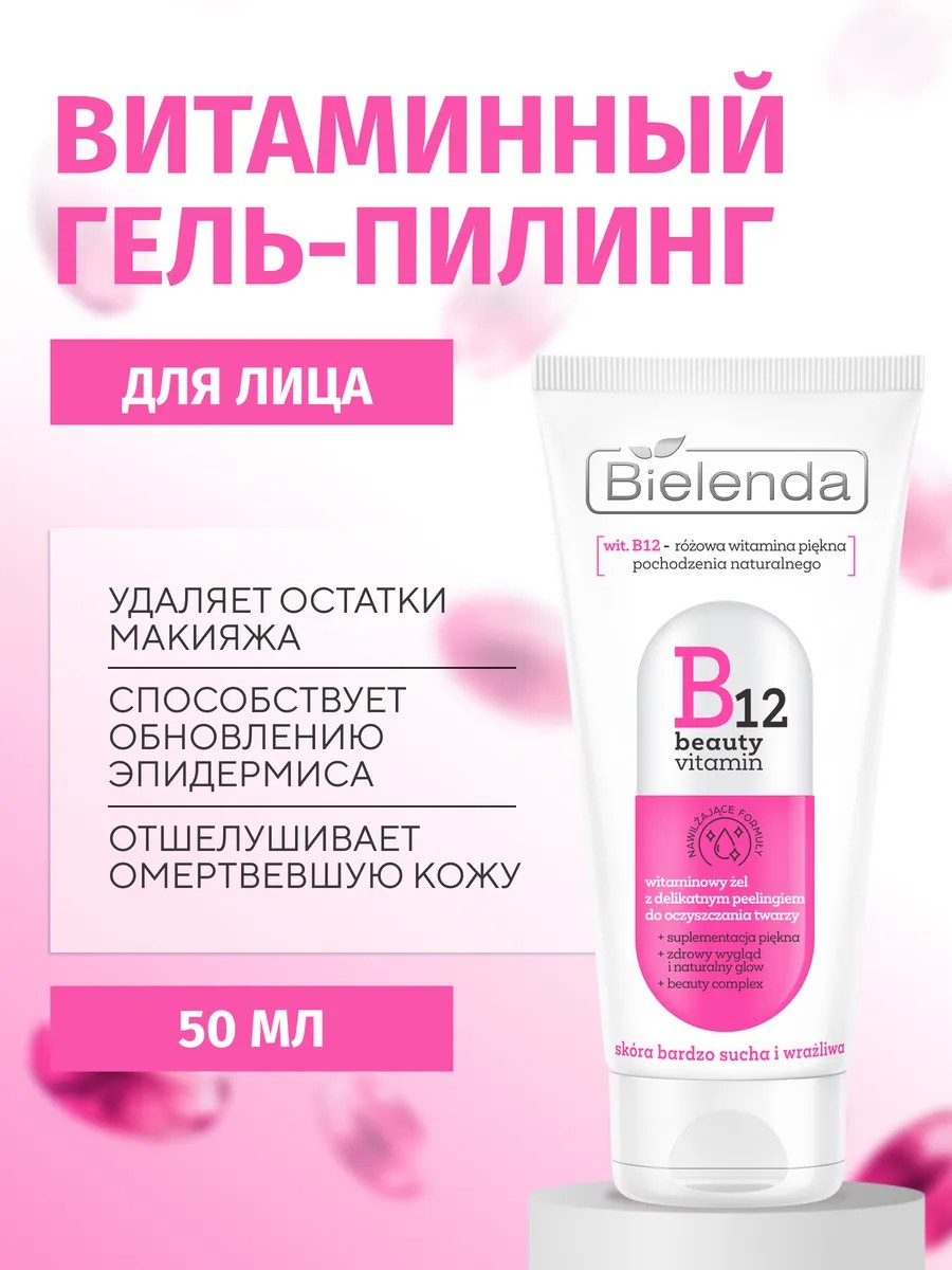 BIELENDA B12 BEAUTY VITAMIN Витаминный гель для умывания лица ГЕЛЬ + НЕЖНЫЙ ПИЛИНГ – высококачественное косметическое средство, предназначенное для ежедневного очищения и освежения сухой и чувствительной кожи. Продукт содержит наш фирменный комплекс красоты, в состав которого входят следующие ингредиенты: -ВИТАМИН B12: это натуральный витамин красивого розового цвета, известный своими смягчающими и успокаивающими свойствами для чувствительной и подверженной стрессу кожи. Кроме того, он ускоряет процессы регенерации кожи, придавая ей сияющий вид. -БИОТИН: этот ингредиент улучшает состояние кожи, обладает сильными увлажняющими и регенерирующими свойствами, успокаивает и обеспечивает комфорт коже, склонной к высыханию. -КОЛЛАГЕН: заметно оживляет кожу, эффективно увлажняя ее и придавая жизненную силу, которую кожа теряет с течением времени. -ПРОВИТАМИН D3: помогает успокоить кожу и поддерживает естественный защитный барьер эпидермиса. Возвращает коже комфорт и здоровое сияние. Дополнительно гель содержит натуральные отшелушивающие частицы. Гель тщательно моет и очищает кожу лица, не вызывая чрезмерного пересыхания. Эффективно удаляет остатки макияжа и другие загрязнения кожи. Благодаря содержанию нежных отшелушивающих частиц гель бережно отшелушивает омертвевшую кожу, способствуя регенерации кожи.