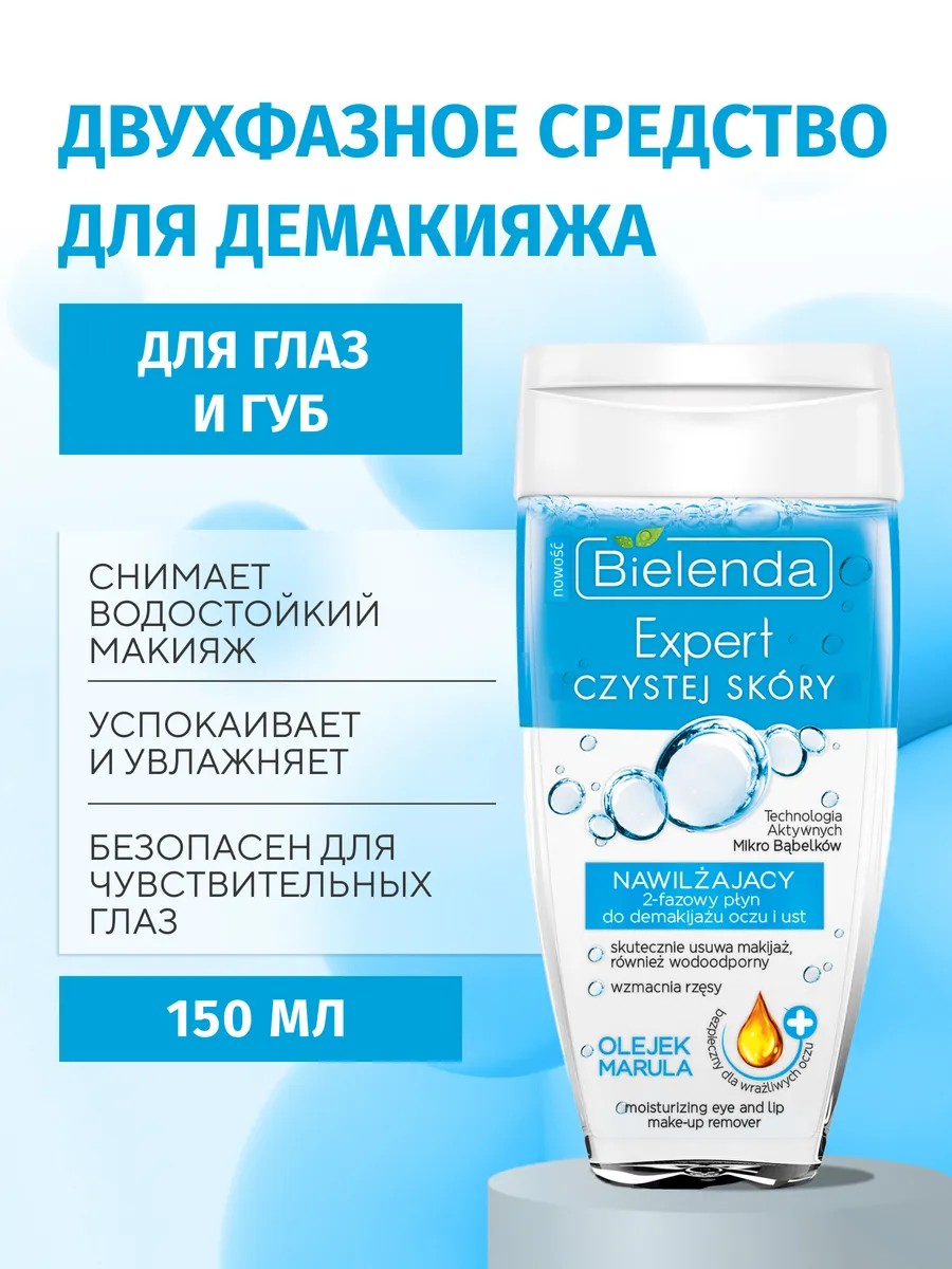 Быстро и эффективно удаляет макияж, в том числе, водостойкий. Укрепляет ресницы, увлажняет глазаПрепарат БЕЗ ЗАПАХА, нежный и мягкий даже для чувствительных глаз. Успокаивает, смягчает раздражения. Не оставляет жирного слоя, не сушит кожу. Безопасен для тех, кто носит контактные линзы. Увлажняющая 2-фазная жидкость для снятия макияжа с глаз и губ содержит необычайно эффективное сочетание МАСЛА МАРУЛЫ, содержащегося в масляной фазе, с ГИАЛУРОНОВОЙ КИСЛОТОЙ в водяной фазе.Масляная фаза гарантирует эффективное и быстрое снятие макияжа с глаз (карандаш, тени, водостойкая тушь для ресниц) и губ (блеск, помада) без необходимости растирания.Водяная фаза обеспечивает идеальное очищение и освежение кожи.Масло марулы регенерирует и питает нежную кожу под глазами и на веках, эффективно укрепляет, защищает и ухаживает за ресницами. Гиалуроновая кислота интенсивно увлажняет тонкую и нежную кожу вокруг глаз. D-Пантенол успокаивает, регенерирует и оптимально увлажняет.