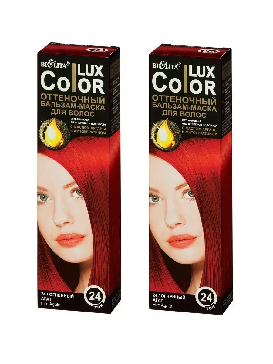 Комплект 2 упаковки. Bielita Бальзам-маска оттеночный для волос Color Lux, тон 24 Огненный агат, 100 мл. Оттеночный бальзам Color Lux не содержит аммиака, перекиси водорода и парабенов. В составе бальзама присутствует масло арганы - одно из самых ценных и редких масел в мире, которое богато витаминами A, E и F, антиоксидантами и ненасыщенными жирными кислотами. Благодаря фитокератину, который выделяется из пшеничных протеинов и аминокислот, бальзам проникает во внутренний слой волоса, восстанавливает его и обеспечивает питание и увлажнение. Бальзам Color Lux защищает цвет волос от вымывания и повреждений, сохраняя его яркость и насыщенность. Бальзам восстанавливает поврежденные участки волос, делает их мягкими, эластичными и блестящими. Маска для тонких волос. Специальная формула бальзама подходит для тонких волос, так как не утяжеляет их и не делает жирными.