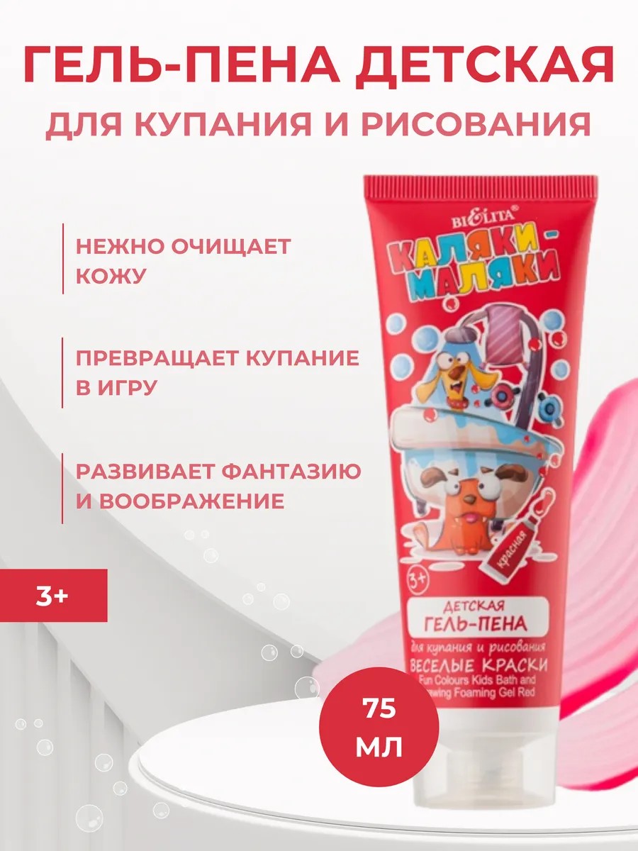 Пена для ванны детская Веселые краски BIELITA подходит для купания и рисования во время принятия душа вашим малышом. Гель для купания детский нежно очищает кожу ребенка. Его уникальный состав позволяет не только купаться в ванной, но и почувствовать себя настоящим художником. Яркий красный цвет гель-пенки понравится ребенку и превратит купание в необыкновенное удовольствие. Можно окрашивать воду, рисовать забавные узоры на поверхностях в ванной, губке или коже ребенка, а затем вспенивать их и смывать водой. Гель пена для душа развивает детскую фантазию и воображение. Она превращает купание в веселье. После использования смойте теплой водой. Избегайте попадания в глаза и рот. Использовать только под присмотром взрослых. Хранить в недоступном для детей месте. Подходит для использования для детей от 3-х лет.