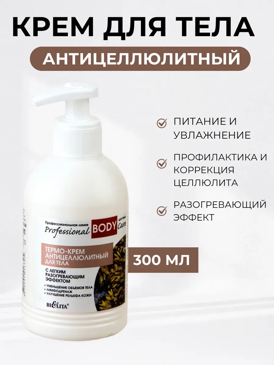 Крем для тела Professional Body Care антицеллюлитный с разогревающим эффектом - это косметический продукт отт бренда Белита, который предназначен для профилактики и устранения начальных стадий целлюлита. Антицеллюлитный крем помогает выравнивать рельеф кожи во время послеродового восстановления. Кроме этого, крем способствует повышению упругости и эластичности кожи. Он содержит 18 биологически-активных компонентов, которые обеспечивают активизацию обменных процессов, способствуют расщеплению жиров в проблемных зонах. Специальный SPA-комплекс (соль Мертвого Моря, водоросли — фукус, ламинария, саргассум) и энзимный комплекс (папаин, супероксиддисмутаза, ройбос, элеутерококк, гарпагоситум) нормализуют водно-солевой обмен, способствуют выведению токсинов и излишней жидкости, восстанавливают структуру дермы. Кофеин, теофиллин и экстракт красного перца стимулируют циркуляцию крови, создают гипотермический эффект, способствуют сжиганию жиров. Натуральные масла (ши, абрикоса, зародышей пшеницы) оказывают на кожу увлажняющее действие, питают и смягчают. При регулярном применении, крем от целлюлита и растяжек поможет сократить видимые целлюлитные проявления, за счет чего силуэт тела станет стройнее. Крем антицеллюлитный придаёт приятное ощущение мягкости и комфорта всему тела.