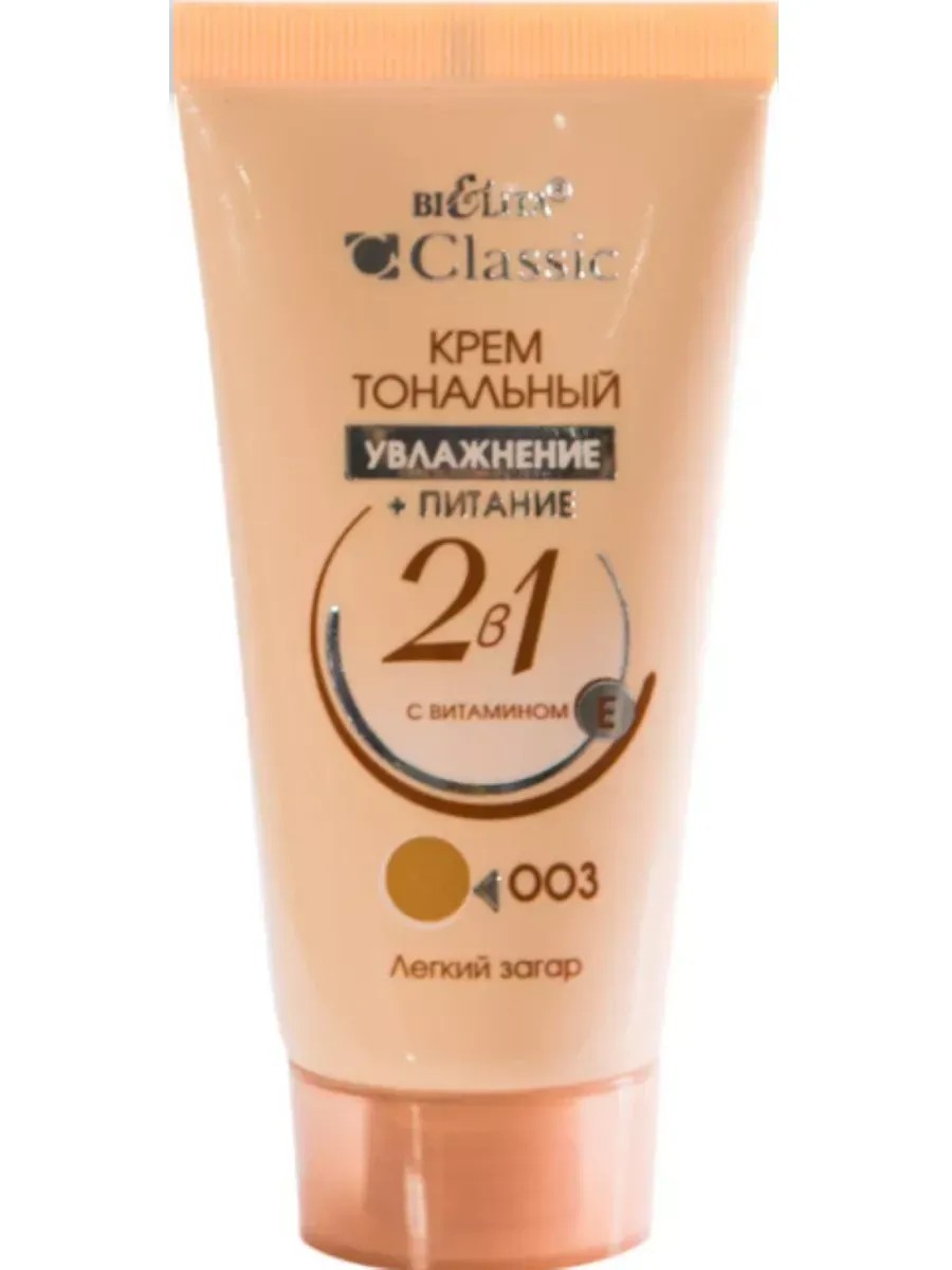 Тональный крем Classic 2в1 тон 003 легкий загар, 30 мл. Крем тональный Увлажнение+Питание 2 в 1 бежевый тон 003 CLASSIC. с витамином Е. витамин Е увлажняет, масло персика питает. Выравнивает цвет лица, скрывает признаки усталости. Формула тонального крема превосходно питает и увлажняет кожу и идеально подстраивается ко всем особенностям цвета лица. Обеспечивает ровное покрытие и скрывает несовершенства, не закупоривает поры.