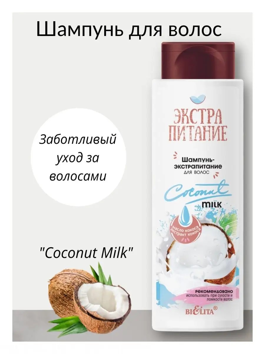 Шампунь-экстрапитание Coconut Milk Белита, белорусская косметика. Мягко очищает волосы и кожу головы от загрязнений и стайлинговых средств. Обеспечивает заботливый уход за волосами, придавая им пленительную красоту и сияющий блеск. Комплекс активных компонентов насыщает волосы и кожу головы необходимыми питательными веществами. Питательный шампунь способствует глубокому увлажнению и восстановлению волос по всей длине. Это позволяет избежать пушения, расслоения и последующей ломкости волос. Кокосовое масло – заполняет пустоты в поврежденных участках волос, глубоко проникает в их структуру. Насыщает питательными и увлажняющими компонентами. Способствует восстановлению волос возвращая им мягкость, гладкость и здоровый блеск. Экстракт кокоса обогащает волосы витаминами, протеинами и аминокислотами. Укрепляет волосяные луковицы. Образует на поверхности волоса защитный слой и оберегает их во время мытья. сушки феном, расчесывании и других процедур. Аллантоин оказывает смягчающее действие на кожу головы. Нормализует деятельность сальных желез, устраняя нежелательную жирность. Защищает от негативного воздействия окружающей среды. Придает волосам силу, свежесть и изумительное сияние. Шампунь для волос женский подходит для ежедневного применения.