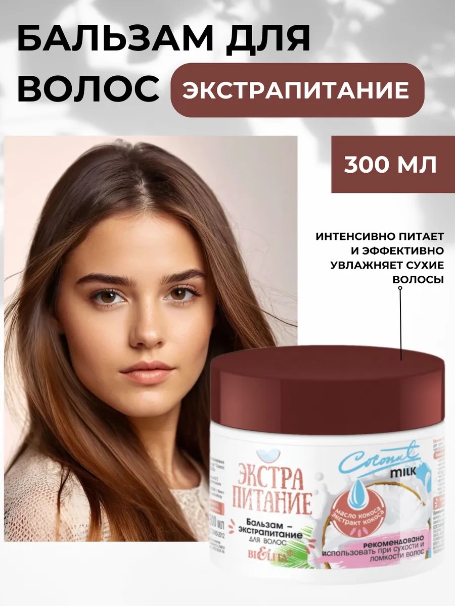 Бальзам для волос Coconut Milk - идеальное средство для ухода за волосами, которые требуют особого внимания. Этот бальзам разработан для сухих, ломких и поврежденных волос, а также для ухода за чувствительной и сухой кожей головы. Кокосовое масло в его составе заполняет пустоты на поврежденных участках волос, глубоко проникает в их структуру, насыщает питательными и увлажняющими компонентами, а также способствует восстановлению. Бальзам для волос увлажняющий придает мягкость, гладкость и здоровый блеск. Экстракт кокоса обогащает волосы витаминами, протеинами и аминокислотами, укрепляет волосяные луковицы, образует на поверхности волоса защитный слой и оберегает их во время мытья, сушки феном, расчесывании и других процедур. Этот кондиционер для волос обладает уникальными свойствами, которые помогут вам достичь желаемого результата. Волосы станут более послушными и мягкими. Бальзам подходит для ежедневного применения! Выбирай уход для волос вместе с брендом Белита.