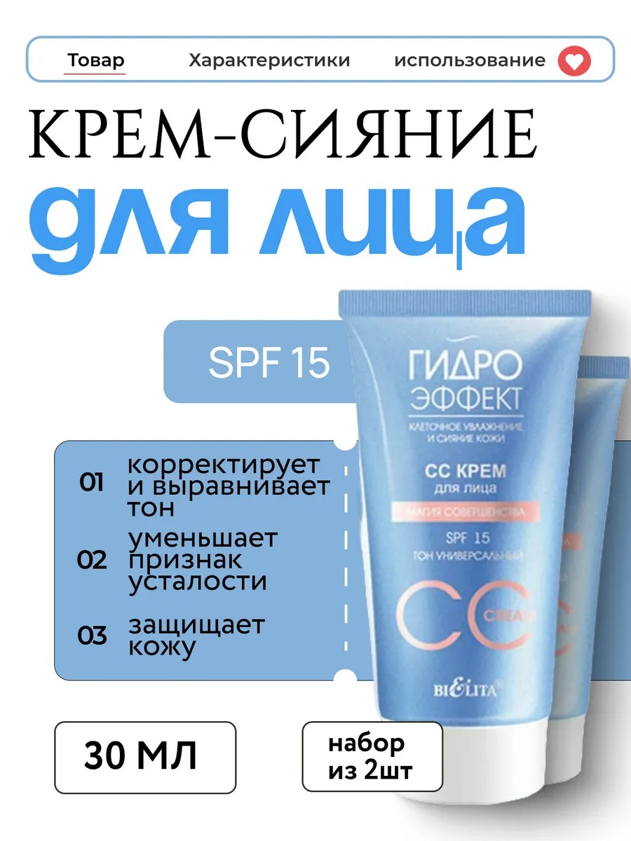 КомплектацияСС Крем для лица SPF 15 Магия совершенства (тон универсальный) Гидроэффект, 30 мл