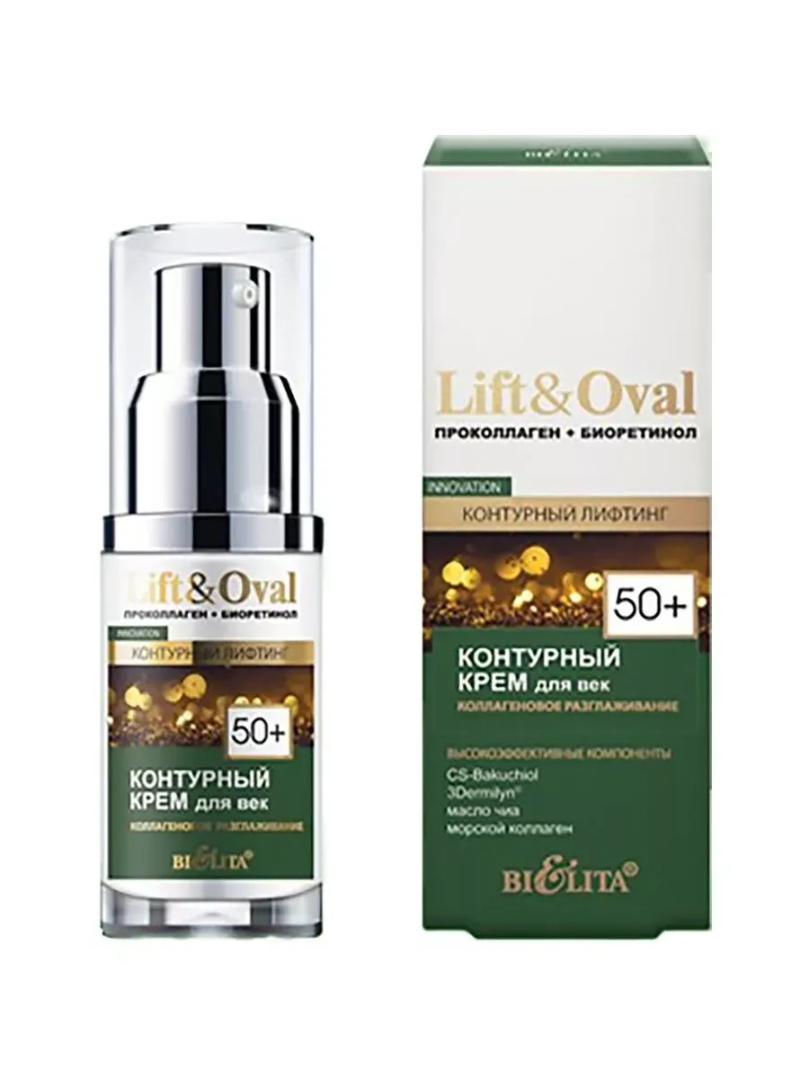 Bielita, Eye Contour Cream 50+ Lift & Oval, 50 ml. Collagen Smoothing Eye Contour Cream strengthens the skin around the eyes, restores the epidermis's moisture-retaining structure, and smoothes fine wrinkles. A complex of active ingredients: chia oil, marine collagen, and squalane combats wrinkles, provides a lifting effect, stimulates collagen and elastin production, reduces dark circles and puffiness under the eyes, and tones the skin. Belarusian anti-aging cosmetics, new product, new collection of eye cream.