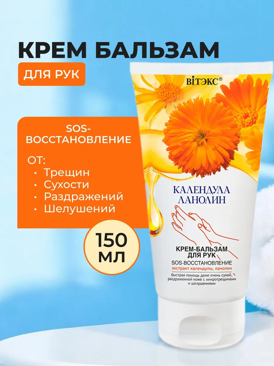 Календула & ланолин крем-бальзам для рук sos-восстановление. Показания к применению: - сухая, обветренная, загрубевшая кожа, - микротрещинки, шелушение и раздражение, - потеря гладкости и мягкости. Насыщенный крем-бальзам для рук совмещает в себе комфорт питательного крема и усиленное восстанавливающее действие активного бальзама. Идеальное средство для sos-помощи сухой, раздраженной коже с микротрещинами и шелушениями. Ланолин – один из наиболее эффективных питательных и восстанавливающих компонентов – благодаря великолепной совместимости с кожей мягко встраивается в гидролипидный слой эпидермиса, насыщает влагой, способствует заживлению микроповреждений, усиливает регенерацию клеток, возвращает коже нежность и гладкость. Масло кокоса быстро улучшает состояние сухой и раздраженной кожи, глубоко питает, устраняет шелушение, смягчает кутикулу, делает кожу мягкой и ухоженной. Экстракт календулы и бисаболол оказывают оздоравливающее, антимикробное и противовоспалительное действие, снимают раздражение и покраснение, улучшают процессы восстановления, способствуют заживлению микротрещин, повышают эластичность кожи. Результат: глубоко увлажненная, гладкая и мягкая кожа без шелушений и трещинок. Применение: нанесите на чистую кожу, помассируйте до полного впитывания.