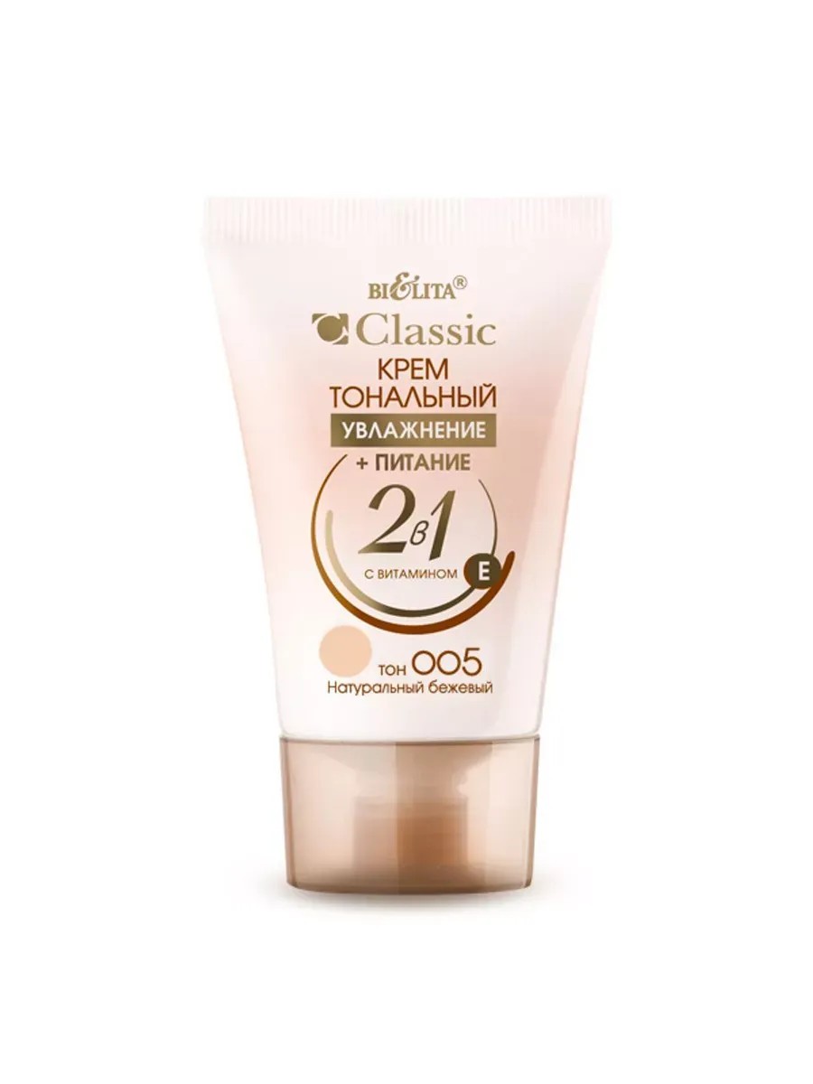 Bielita, Крем тональный Увлажнение+Питание 2 в 1, тон 005 натуральный бежевый, 35 мл. Тональный крем с витамином Е. Витамин Е увлажняет. Масло персика питает. Выравнивает цвет лица, скрывает признаки усталости. Формула тонального крема превосходно питает и увлажняет кожу и идеально подстраивается ко всем особенностям цвета лица. Обеспечивает ровное покрытие и скрывает несовершенства, не закупоривает поры. Применение: нанесите крем на чистую кожу лица, равномерно распределите.