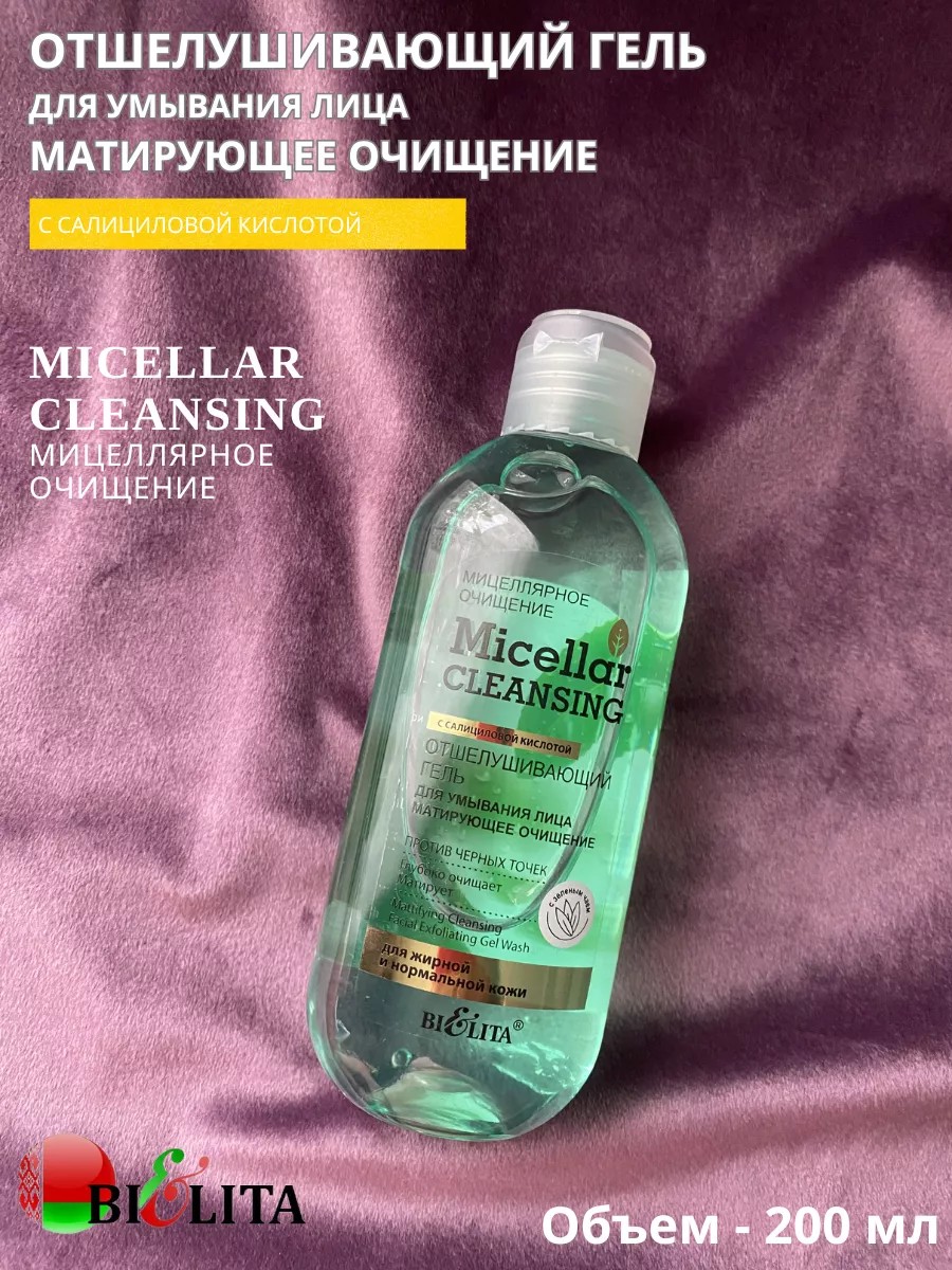 Отшелушивающий гель для умывания лица Матирующее очищение Micellar cleansing от Белита оказывает очищающий и смягчающий эффект на кожу лица, регулируя секреции сальных желез и создавая анти-раздражающий эффект для кожи. Экстракт зеленого чая и календулы выравнивают тон лица, борются с воспалениями, прекрасно увлажняют и успокаивают кожу. Салициловая кислота оказывает многогранное действие на кожу: эффективно отшелушивает ороговевшие клетки кожи, быстро очищает поры от загрязнений, уменьшает воспаления, обладает омолаживающим действием и отбеливает веснушки и пигментацию. Подходит для всех типов кожи, в особенности для жирной и комбинированной.