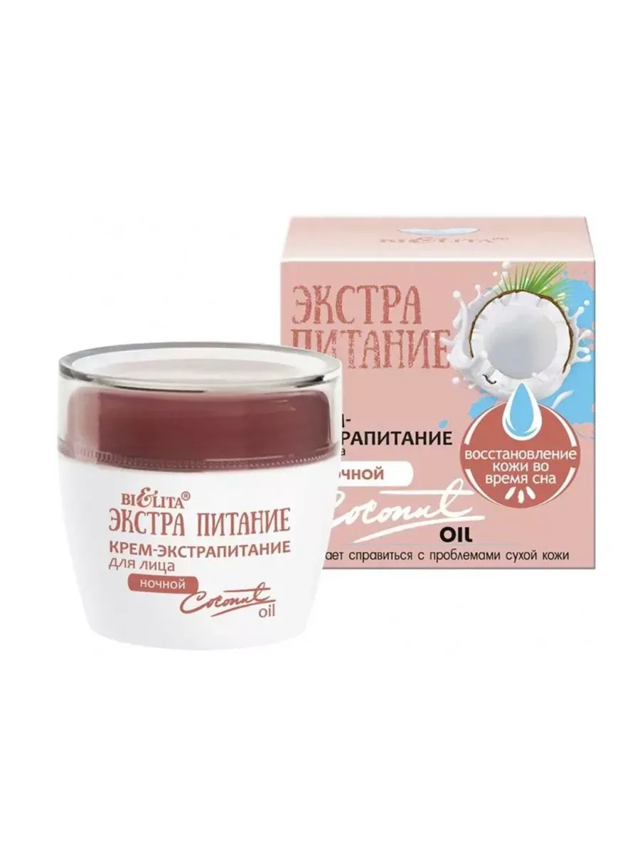 Bielita, Крем-экстрапитание для лица ночной 50 мл. Чудесное средство, которое подарит полноценный питательный и омолаживающий уход вашей коже, обеспечит ее регенерацию пока вы отдыхаете. Комплекс активных компонентов: интенсивно питает кожу во время сна сохраняет гидробаланс кожи, предотвращая потерю клетками молекул воды подтягивает контур лица усиливает естественную регенерацию липидного слоя кожи лица возвращает коже упругость, эластичность, делая ее более плотной и свежей. Масло кокоса – настоящее гурманское удовольствие для кожи – насыщает её ультрапитательными компонентами, эффективно противодействует увяданию кожи, восстанавливает и сохраняет её упругость и эластичность, делая её невероятно гладкой, бархатистой и ухоженной. Экстракт кокоса – обогащает кожу витаминами, протеинами и аминокислотами, сохраняет влагу в структуре клеток, смягчает кожу и тонизирует её. Витамины Е и F – «витамины молодости и красоты»: витамин Е – разглаживает морщинки, подтягивает кожу, дарит упругость и эластичность, за счет увеличения выработки эластина и коллагена, улучшает кровообращение, способствуя проникновению в клетки кислорода. витамин F – комплекс полиненасыщенных жирных кислот, которые помогают сохранить привлекательность кожи, тормозя процессы увядания и возвращая вашу красоту. Комплекс масел сафлоры и косточек абрикоса – питает и наполняет вашу кожу живительной влагой, предотвращая появление сухости, стянутости и шелушения, придавая гладкость вашей коже и лучезарное сияние. Tens`Up – уникальный активный комплекс, обладает мгновенным лифтингом, подтягивает кожу, разглаживает морщинки и укрепляет матрицу кожи. Крем-экстрапитание – это настоящее кокосовое лакомство для вашей кожи, которое необходимо употреблять перед сном.