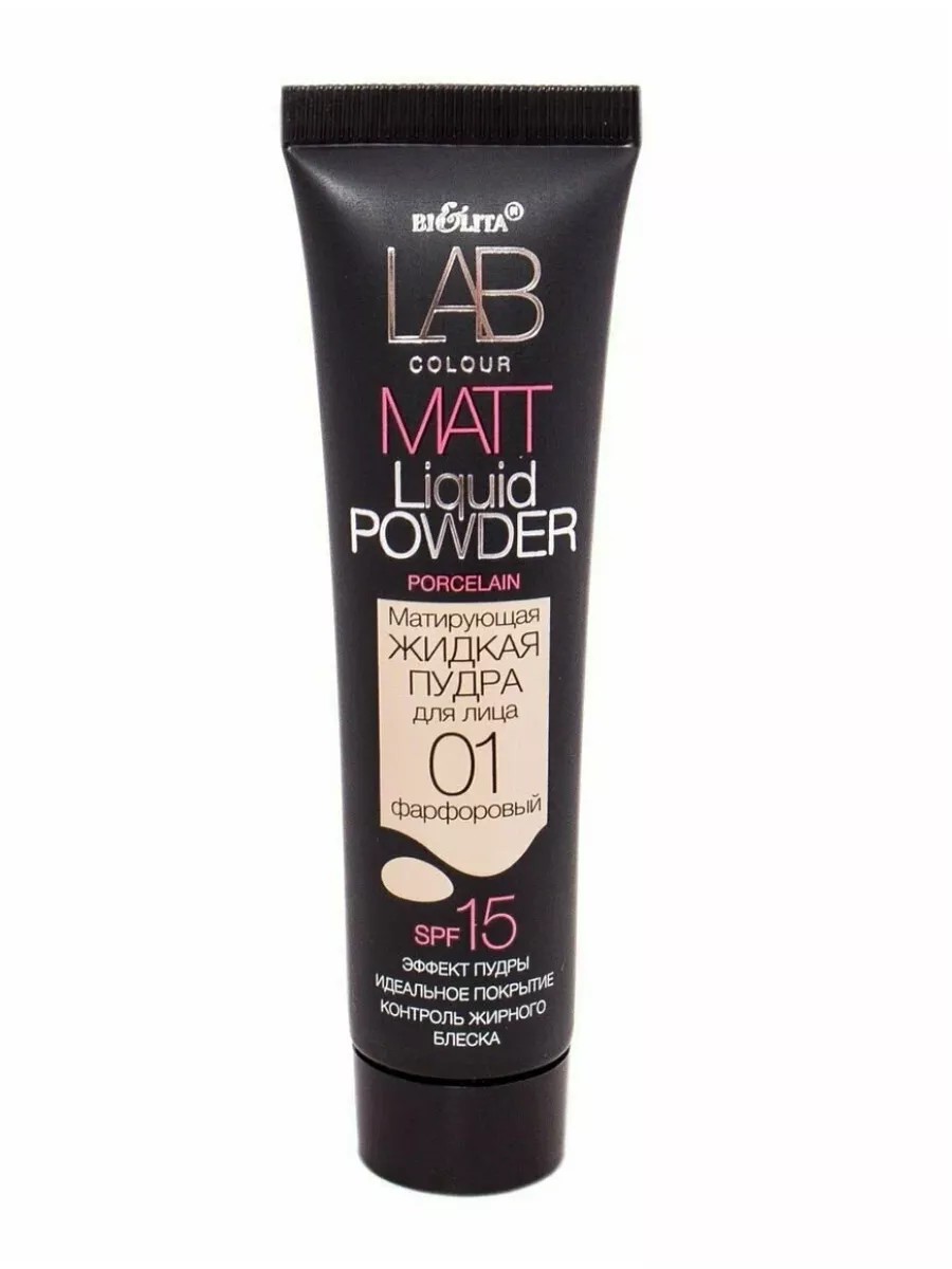 Bielita LAB color, Liquid Mattifying Powder, Shade 01 Porcelain, 30 ml. This mineral-based liquid powder conceals imperfections and evens out skin tone. Its soft, velvety texture evenly coats the face with a delicate veil, eliminating shine. It creates a weightless matte finish that's undetectable on the skin, allowing it to breathe and not clogging pores. Features: Powder effect. Perfect coverage. Controls shine. How to use: Apply liquid powder to clean skin and distribute evenly.