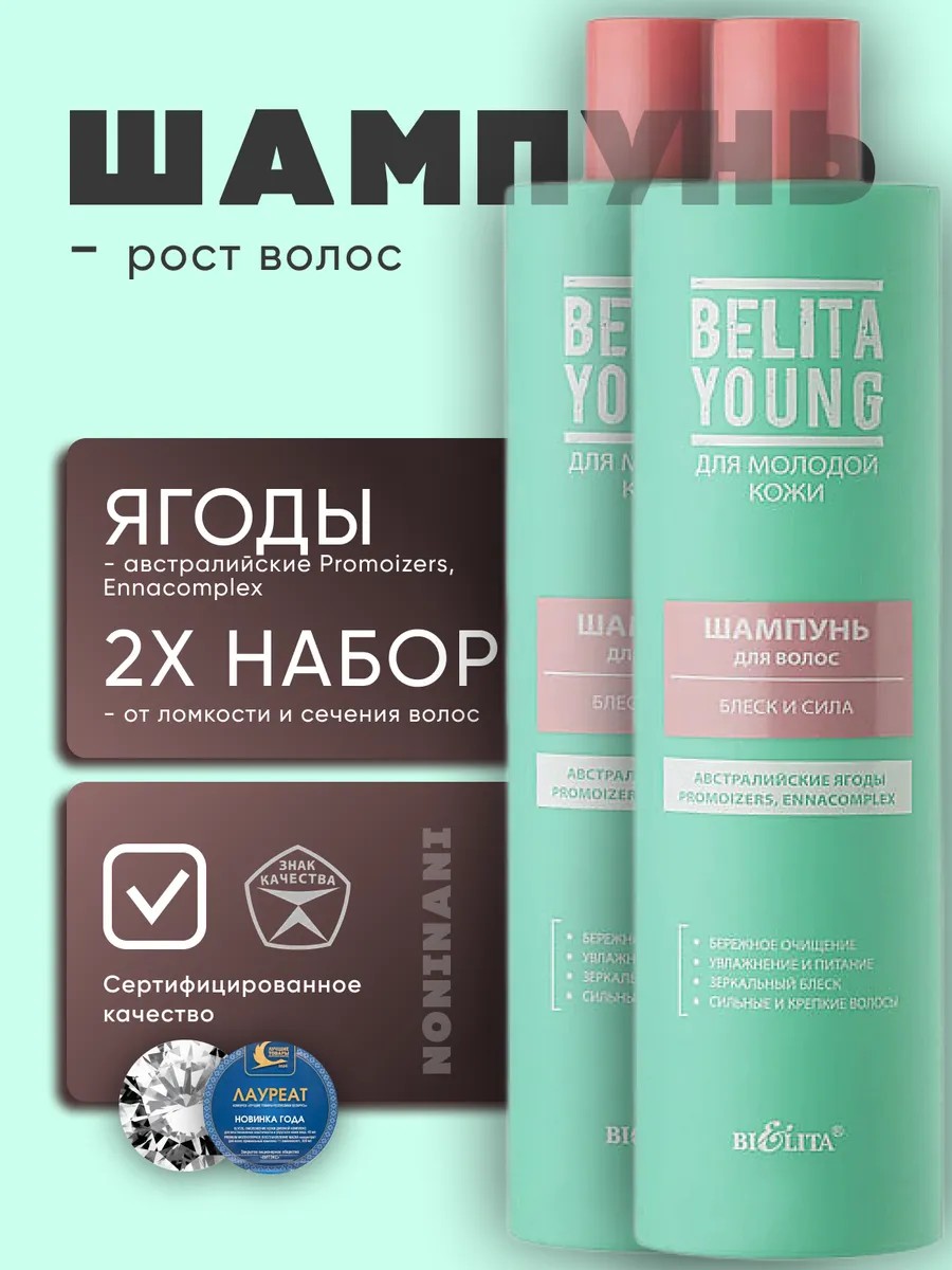 Belita Young Shine and Strength Shampoo. Australian berries, Promoizers, Ennacomplex. - Gentle cleansing - Moisturizing and nourishing - Mirror-like shine - Strong and vibrant hair. This shampoo gently cleanses, moisturizes, and nourishes hair, preventing breakage and split ends. Its specially selected formula makes hair strong and manageable, strengthens, and stimulates hair growth. A special conditioning system gives hair amazing shine and vitality. Natural Promoizers moisturize the scalp and maintain its moisture balance. Ennacomplex strengthens hair and promotes growth. Australian berry extract moisturizes and nourishes hair, saturates it with vitamins and minerals, and protects against external, aggressive environmental influences.