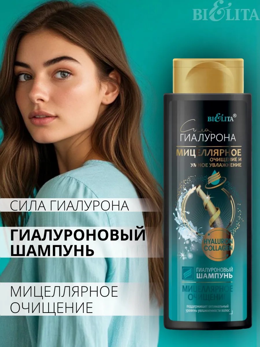 Шампунь для волос Сила гиалурона Мицеллярное очищение умное увлажнение, белоруссвкой косметики Белита. Бережно очищает волос и кожи головы от загрязнений и остатков стайлинговых средств. Микроскопические частицы, известные как мицеллы, входящие в состав шампуня, притягивают к себе грязь и себум, затем легко смываются вместе с водой и густой пеной. Комплекс активных компонентов, включающий гиалуроновую кислоту, коллаген и ледниковую воду, обеспечивает качественную очистку волос и кожи головы от силиконов и излишков себума, в то же время поддерживает оптимальный уровень увлажненности волос. Результатом применения данного шампуня являются блестящие и здоровые волосы с естественным сиянием. Мицеллярный шампунь для волос женский подходит для ежедневного применения.