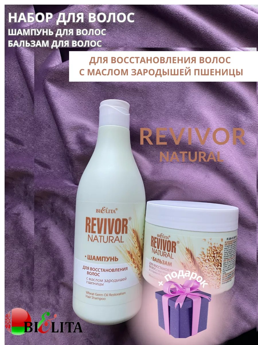 В косметический набор Revivor Natural входит: шампунь для восстановления волос с маслом зародышей пшеницы Revivor Natural 500мл; бальзам для восстановления волос с маслом зародышей пшеницы Revivor Natural 300мл. «Revivor Natural» – восстанавливающая формула на основе протеинов пшеницы, которая бережно очищает и увлажняет ваши волосы, делая их мягкими и шелковистыми. Активные компоненты линии: Масло зародышей пшеницы питает, укрепляет и утолщает волосы по всей длине. Д-пантенол, кератин, коллаген и протеины пшеницы восстанавливают поврежденную структуру волос, обеспечивают глубокое увлажнение, придают волосам шелковистость, гладкость и упругость. Рекомендации по использованию линии «Revivor Natural»: нанесите шампунь на кожу головы и смойте водой; бальзам необходимо распределить на длину волос, избегая попадания на кожу головы и выдержать 1-2 минуты.