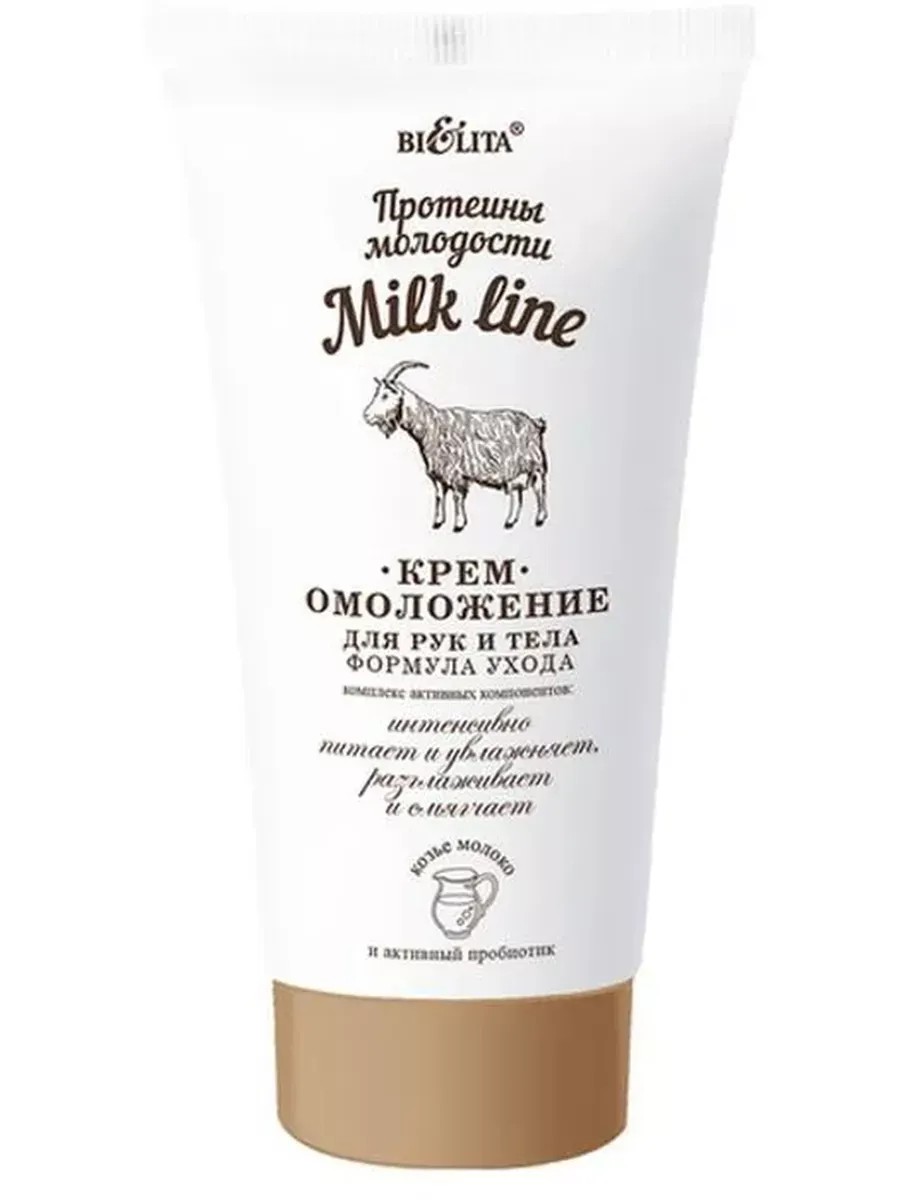 Milk Line Rejuvenating Hand and Body Cream. Care Formula, 150 ml. The cream has an incredibly soft, silky texture that absorbs quickly without leaving a feeling of dryness or tightness. Goat's milk proteins, combined with an active probiotic, rejuvenate, nourish, and soften the skin of the hands and body, leaving it soft and silky. TONISKIN stimulates collagen synthesis and smoothes the skin's microrelief. A complex of vitamins A, C, E, and F has high antioxidant activity and improves cellular regeneration, resulting in faster renewal and a younger-looking skin. Coconut oil nourishes the skin of the hands and body, giving it firmness and elasticity.