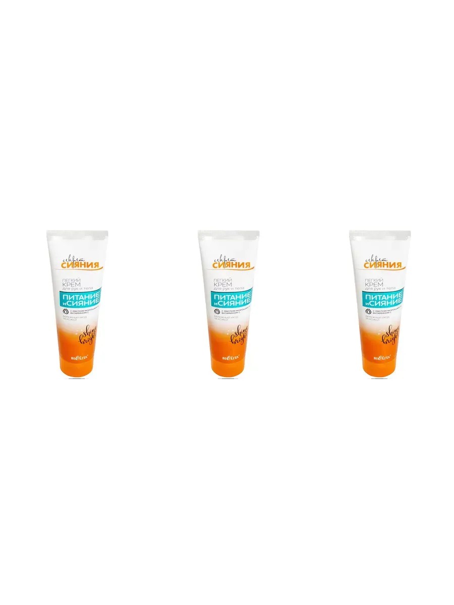 Секрет сияния Крем для рук и тела "Питание и сияние", 100 мл. Легкий крем для рук и тела - бережный уход за Вашей кожей. Комплекс активных компонентов, входящий в состав крема, воздействует на кожу по нескольким направлениям:питает кожу, придавая ей гладкость, нежность и эластичность;великолепно увлажняет кожу, придавая естественное сияние; защищает от агрессивных факторов окружающей среды. Масло лесного ореха обладает великолепными увлажняющими и смягчающими свойствами, восстанавливает кожу, делая её гладкой, нежной и эластичной. В комплекте 3 штуки.