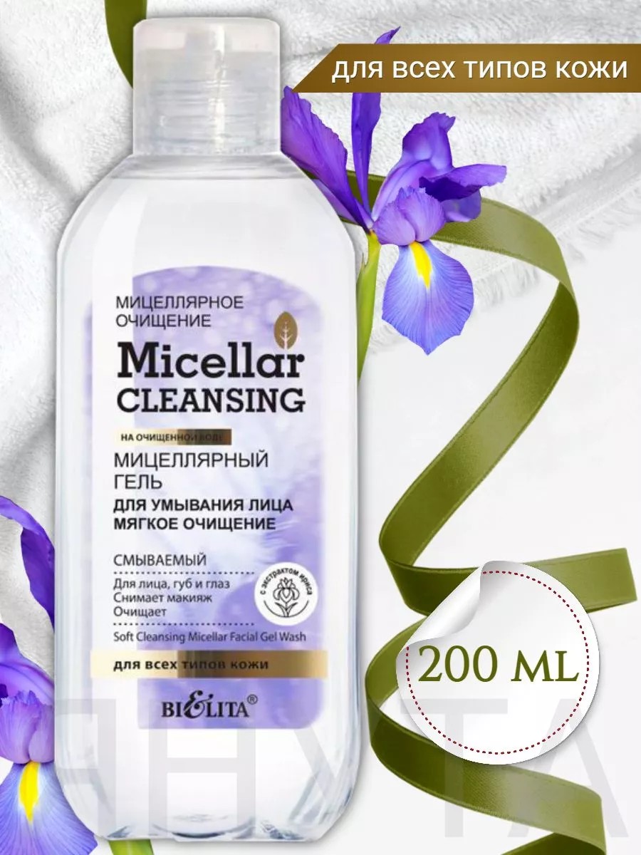 Мицеллярный гель для умывания лица Мягкое очищение на очищенной воде 200 мл. Мицеллярный гель для умывания лица Мягкое очищение обеспечивает глубокую очистку кожи, тщательно удаляя загрязнения и остатки декоративной косметики. Благодаря экстрактам ириса и орхидеи в составе продукта повышается сопротивляемость кожи негативным факторам окружающей среды, усиливается кожный иммунитет, замедляет процессы старения кожи. Рекомендуется для всех типов кожи. Применение: нанесите на влажную кожу, смойте водой.