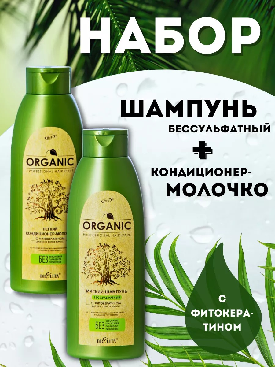 Косметический набор 2в1 для ухода за волосами ORGANIC: Мягкий бессульфатный ШАМПУНЬ 500 мл, лёгкий КОНДИЦИОНЕР-МОЛОЧКО 500 мл на основе протеиново-аминокислотного комплекса PHYTOKERATIN для всех типов волос.Максимально подобранное сочетание мягких моющих (бессульфатных) компонентов и натуральных ухаживающих ингредиентов бережно очищает волосы и кожу головы, эффективно удаляя все загрязнения.