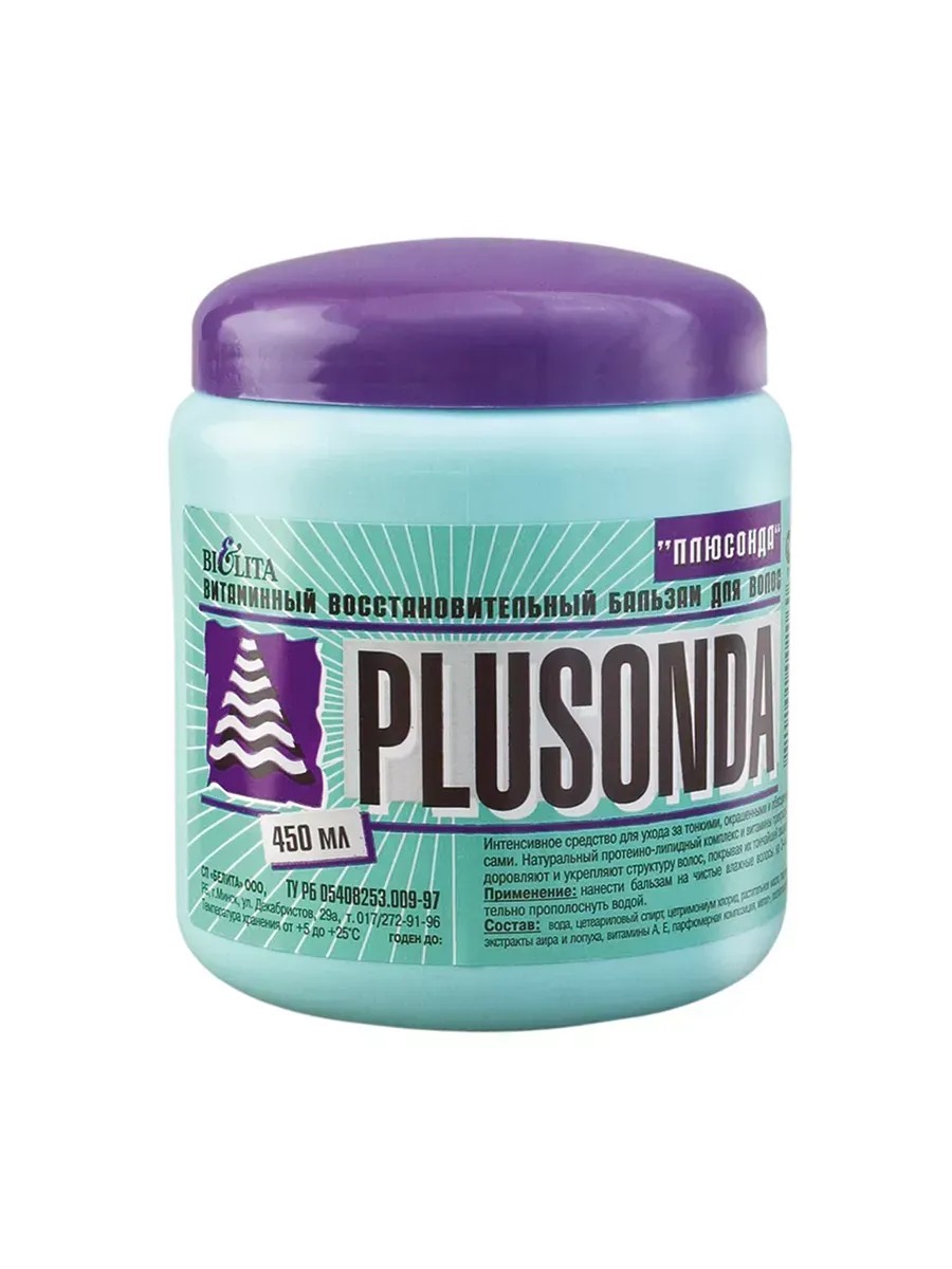 Bielita, Plusonda Vitamin Restorative Conditioner, 450 ml, 1 pc. An intensive treatment for fine, color-treated, and bleached hair. A natural protein-lipid complex and vitamins perfectly nourish, heal, and strengthen the hair structure, covering it with a thin protective film. Directions: Apply the conditioner to clean, damp hair for 3-4 minutes, then rinse thoroughly with water. Ingredients: Water, Cetearyl Alcohol, Cetrimonium Chloride, Helianthus Annuus (Sunflower) Seed Oil, Parfum (Fragrance), Arctium Lappa (Burdock) Root Extract, Acorus Calamus (Calamus) Extract, Hydrolyzed Collagen, Citric Acid, Methylparaben, Benzyl Alcohol, Methylchloroisothiazolinone, Methylisothiazolinone, Propylparaben, Tocopheryl Acetate, Retinyl Palmitate, CI 42090
